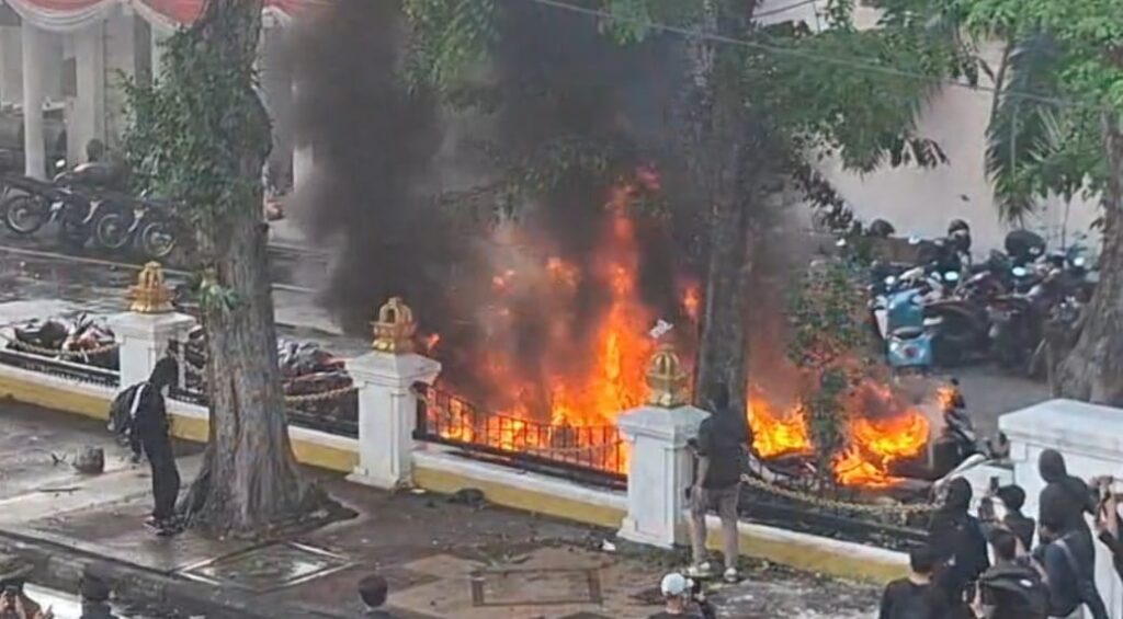 Surabaya, – Gedung Negara Grahadi, Jalan Gubernur Suryo, Kota Surabaya menghitam dampak dari kericuhan demo gabungan antara masyarakat sipil dan pengemudi ojek online (ojol), Jumat (29/8/2025).