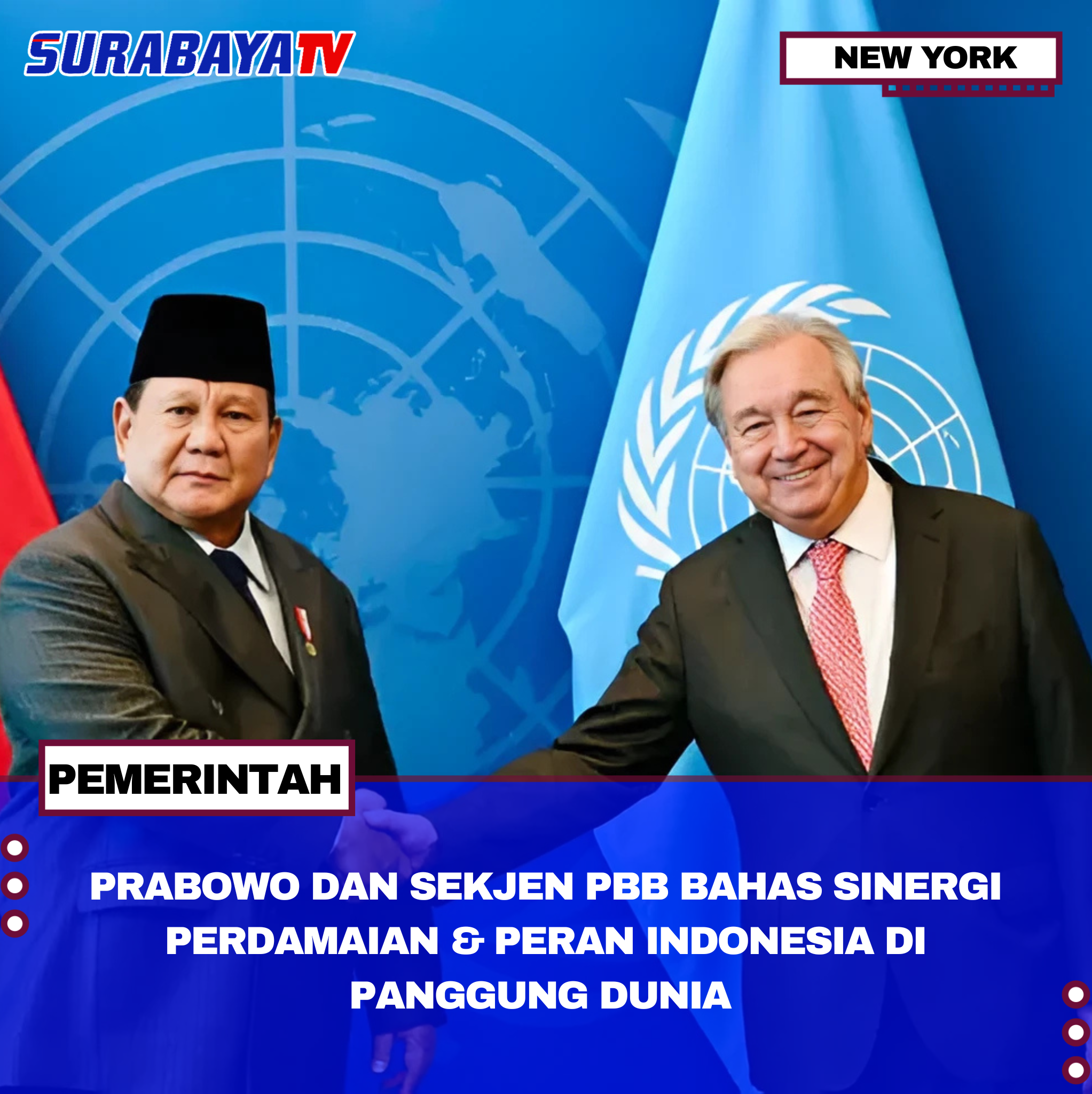 New York – Prabowo Subianto, Presiden RI, bertemu dengan António Guterres, Sekjen PBB, pada Senin (22/9/2025) di Gedung Sekretariat PBB, New York. Pertemuan ini dilakukan setelah Prabowo menyampaikan pidato di Konferensi Internasional Tingkat Tinggi soal penyelesaian damai masalah Palestina.