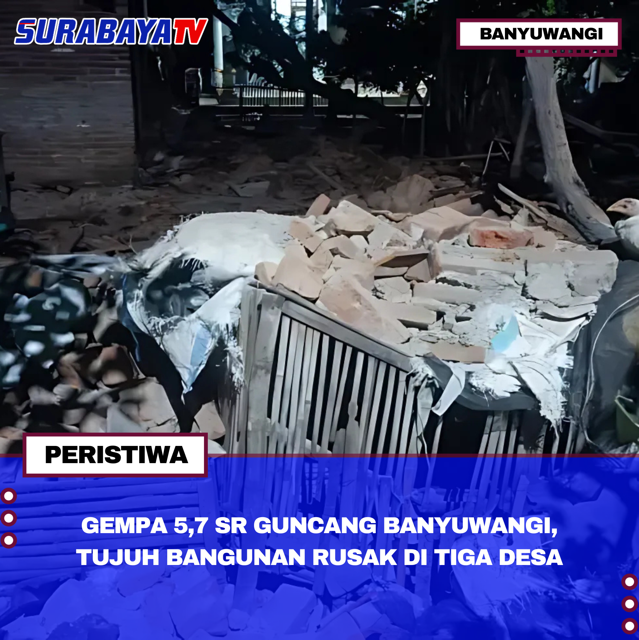 Banyuwangi – Gempa berkekuatan 5,7 magnitudo terjadi Kamis (25/9) pukul 16.04 WIB di timur laut Banyuwangi, tepatnya 46 km dari daratan dan kedalaman 12 km. Gempa ini mengguncang tiga desa di Kecamatan Wongsorejo dan menyebabkan tujuh bangunan mengalami kerusakan ringan hingga sedang.