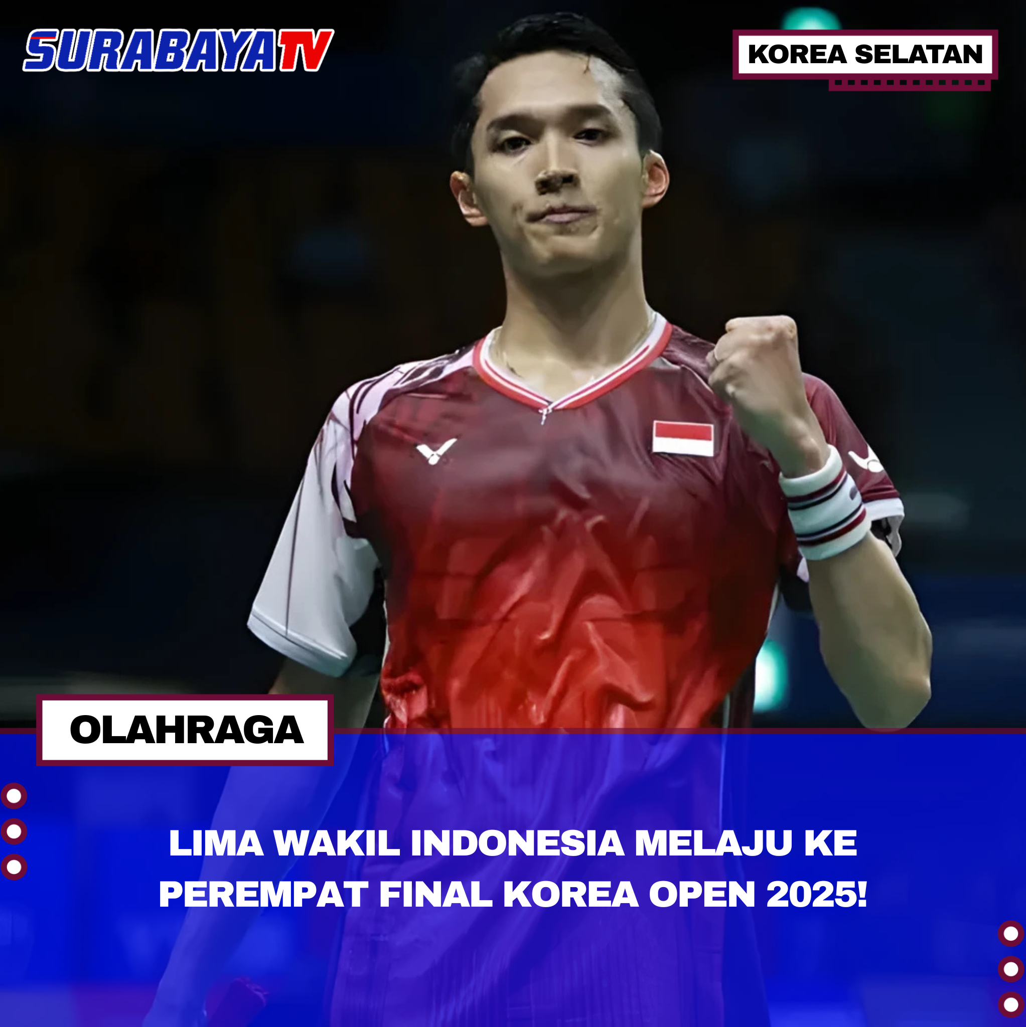 Korea Selatan – Lima pebulu tangkis Indonesia lolos ke perempat final Korea Open 2025 yang digelar Jumat (26/9) di Suwon, Korea Selatan. Mereka adalah Jonathan Christie dan Alwi Farhan (tunggal putra), Putri Kusuma Wardani (tunggal putri), Amri Syahnawi/Nita Marwah (ganda campuran), dan Fajar Alfian/M. Shohibul Fikri (ganda putra).