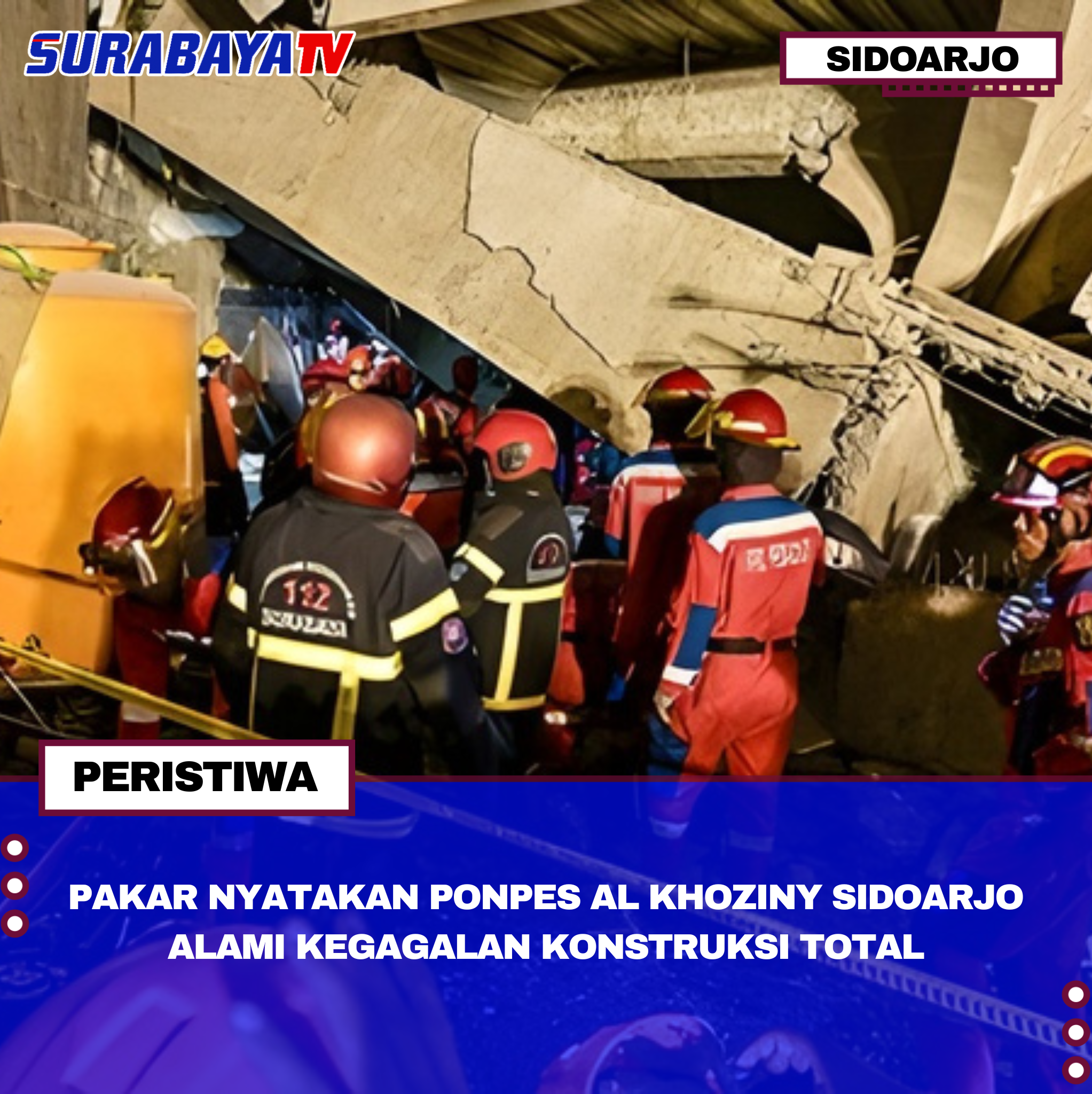 Sidoarjo – Hasil analisis dari pakar ITS menyatakan gedung tiga lantai Pondok Pesantren Al Khoziny di Sidoarjo mengalami kegagalan konstruksi total, menyebabkan bangunan roboh dengan model runtuhan ‘pancake’. Semua penyangga struktur bangunan benar-benar gagal, membuat kondisi reruntuhan sangat berbahaya dan menyulitkan evakuasi korban yang sebagian besar santri.