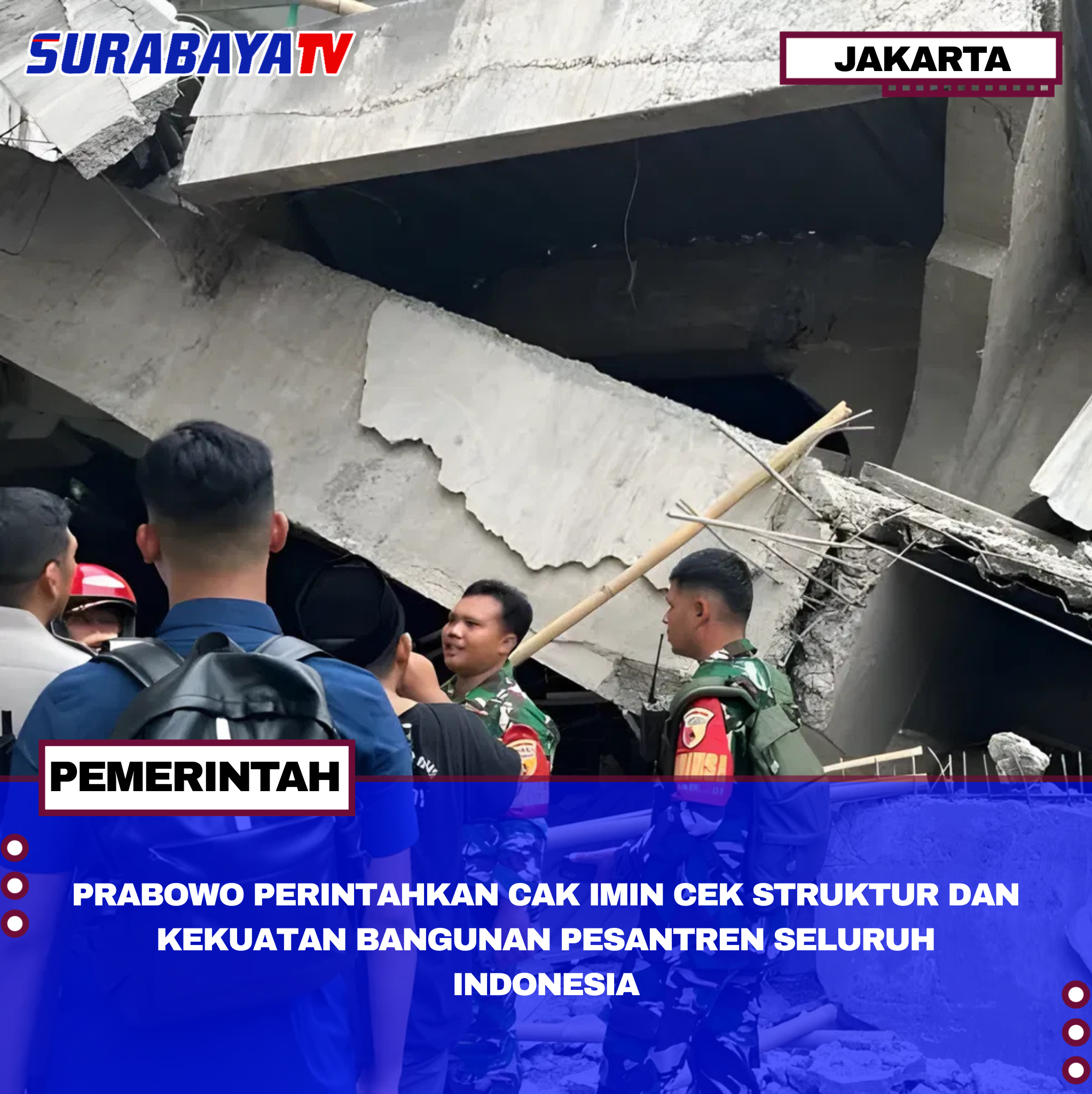 Perintah disampaikan dalam Rapat Kabinet terbatas Minggu (5/10/2025) malam di kediaman Presiden, dengan tujuan mencegah kejadian serupa. Prabowo juga menginstruksikan agar pemilik pondok pesantren memperhatikan renovasi dan pengembangan gedung dengan serius untuk menjamin keselamatan.