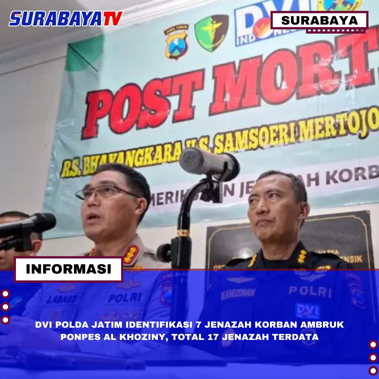 Surabaya – Tim DVI Polda Jatim berhasil mengidentifikasi tujuh jenazah korban ambruknya Pondok Pesantren Al Khoziny pada Senin (6/10/2025). Jenazah ini sudah dicocokkan data Ante Mortem dan Post Mortem, terdiri dari remaja berusia 13-19 tahun dari berbagai daerah seperti Bangkalan, Bekasi, dan Semarang.