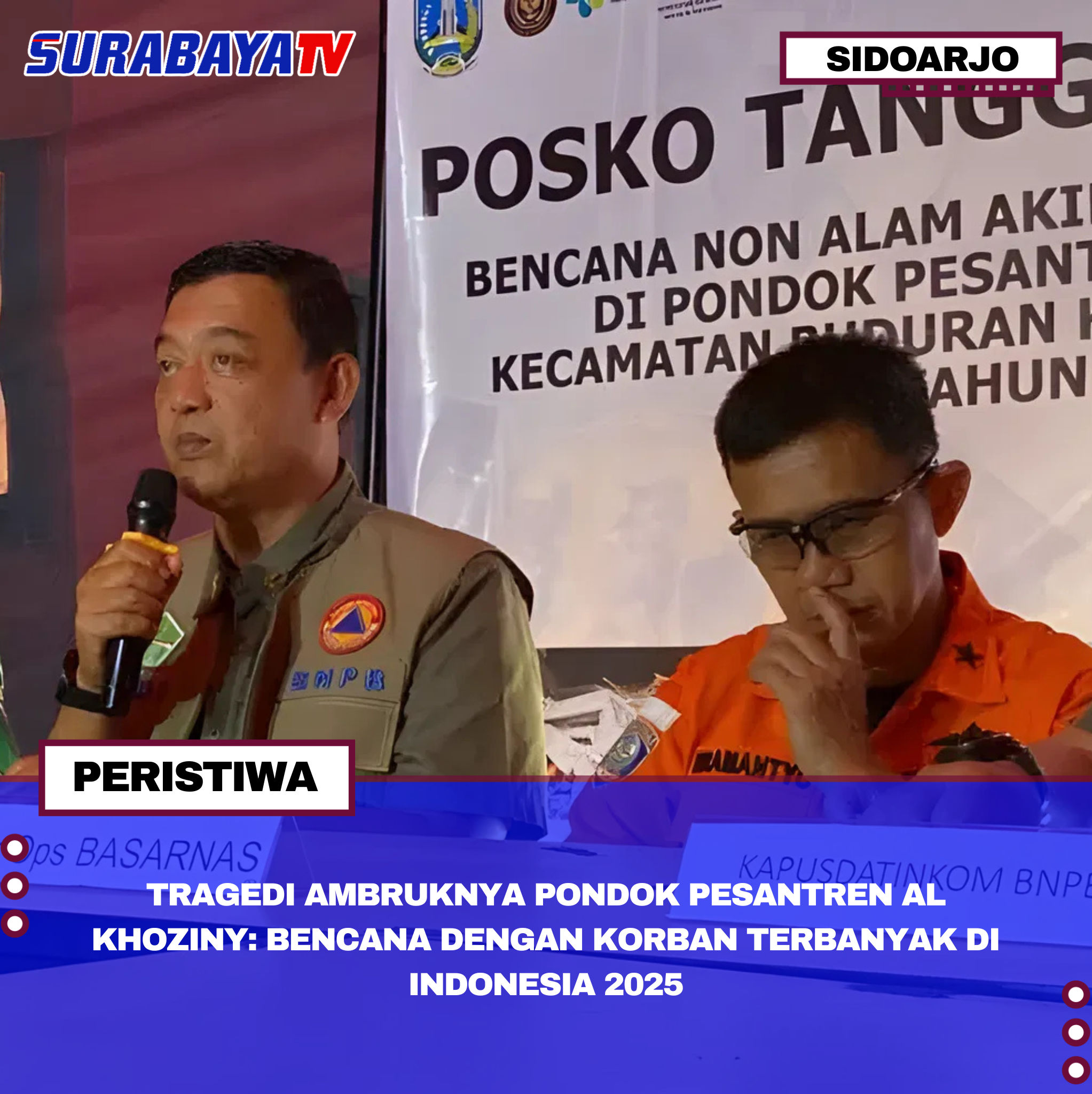 Sidoarjo – Tragedi ambruknya bangunan tiga lantai Pondok Pesantren Al Khoziny di Sidoarjo terjadi pada awal Oktober 2025. Insiden ini menyebabkan lebih dari 50 orang tewas, menjadikannya bencana dengan korban jiwa terbanyak di Indonesia tahun ini, menurut Mayor Jenderal Budi Irawan dari BNPB.