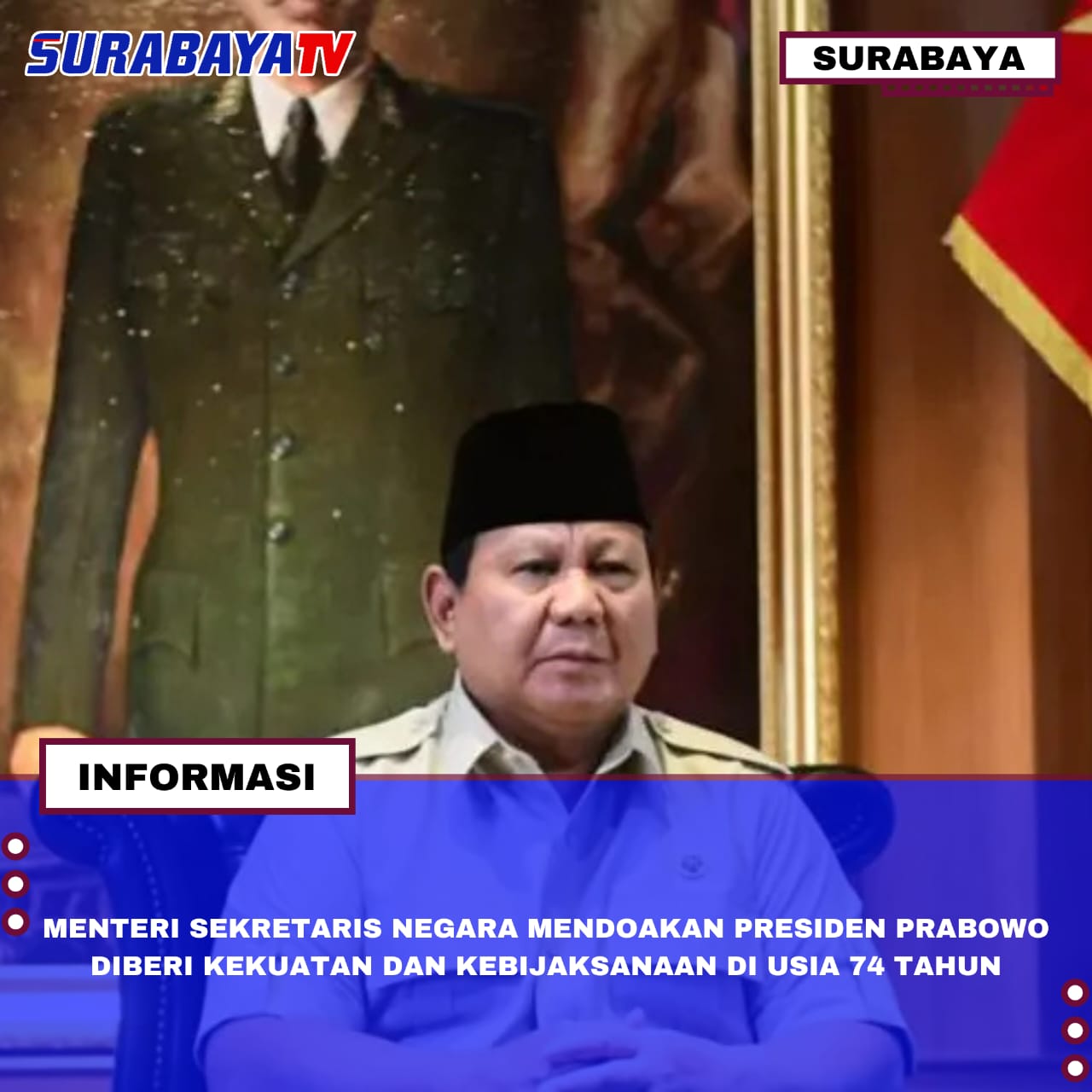 Surabaya – Menteri Sekretaris Negara Prasetyo Hadi mengucapkan selamat ulang tahun ke-74 kepada Presiden Prabowo Subianto dan mendoakan agar beliau selalu diberi kesehatan, kekuatan, dan kebijaksanaan dalam memimpin bangsa. Prasetyo berkata, “Semoga Bapak senantiasa dianugerahi kesehatan, kekuatan, dan kebijaksanaan oleh Allah SWT dalam menjalankan amanah besar memimpin bangsa.”