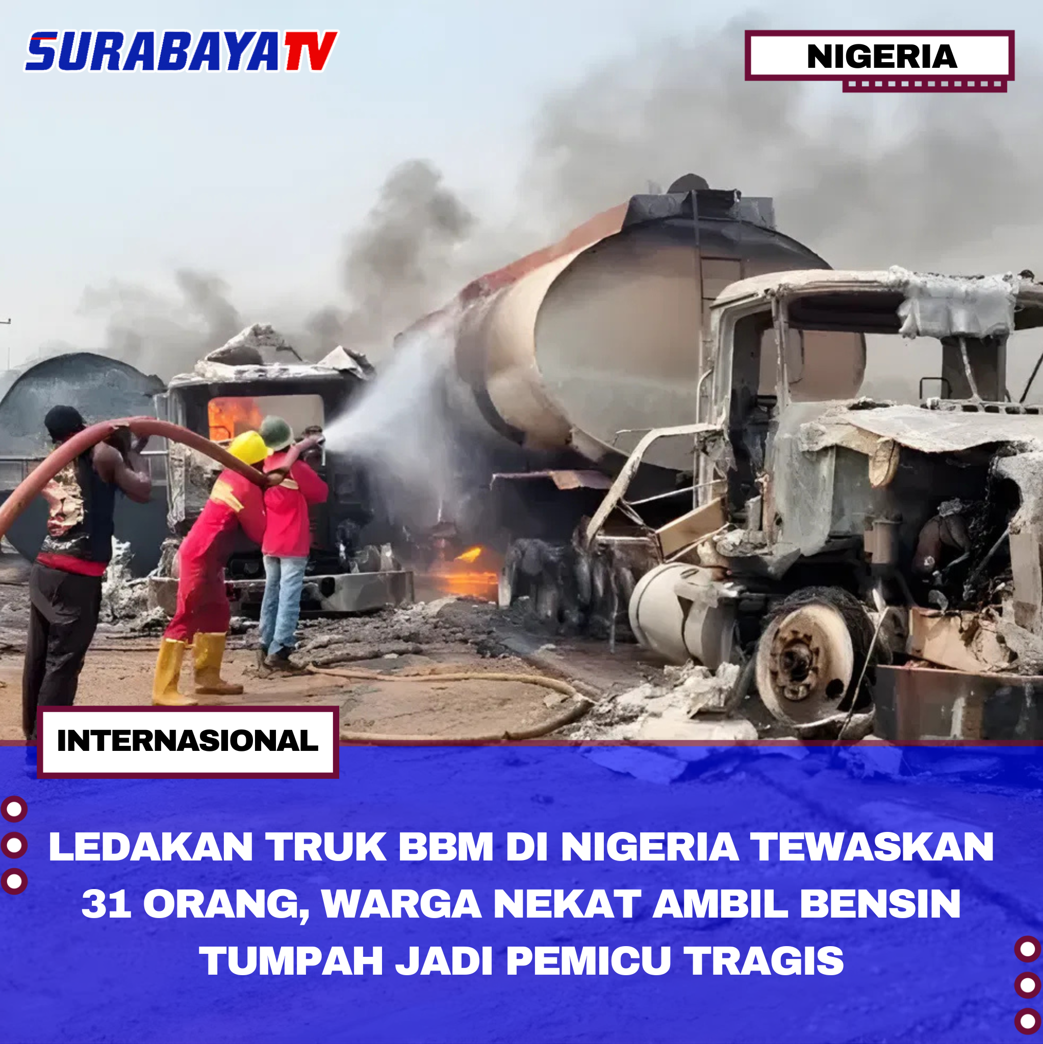 Nigeria – Tragedi ledakan truk bahan bakar minyak (BBM) di wilayah Bida, Negara Bagian Niger, Nigeria utara-tengah, menewaskan sedikitnya 31 orang dan melukai 17 lainnya pada Selasa (21/10/2025). Insiden bermula ketika truk terguling, memicu warga sekitar berbondong-bondong mendekat untuk mengumpulkan bensin yang tumpah, yang kemudian meledak. Wasiu Abiodun, juru bicara Kepolisian Negara Bagian Niger, menyatakan korban luka langsung dilarikan ke rumah sakit terdekat, sementara pihak berwenang sedang menyelidiki identitas pengemudi, pemilik truk, dan akar penyebab kecelakaan.