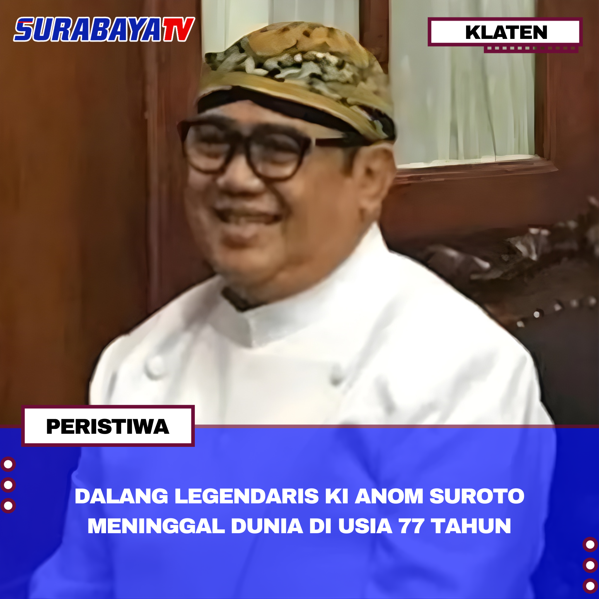 Klaten – Maestro wayang kulit Kanjeng Raden Tumenggung Haryo Lebdo Nagoro atau Ki Anom Suroto meninggal dunia pada Kamis (23/10/2025) setelah dirawat empat hari di RS Dr Oen Kandangsapi karena sakit jantung. Kabar duka ini dikonfirmasi putranya, Jatmiko, yang juga dalang wayang kulit, saat mengurus jenazah. “Iya benar bapak meninggal dunia tadi,” ujarnya.