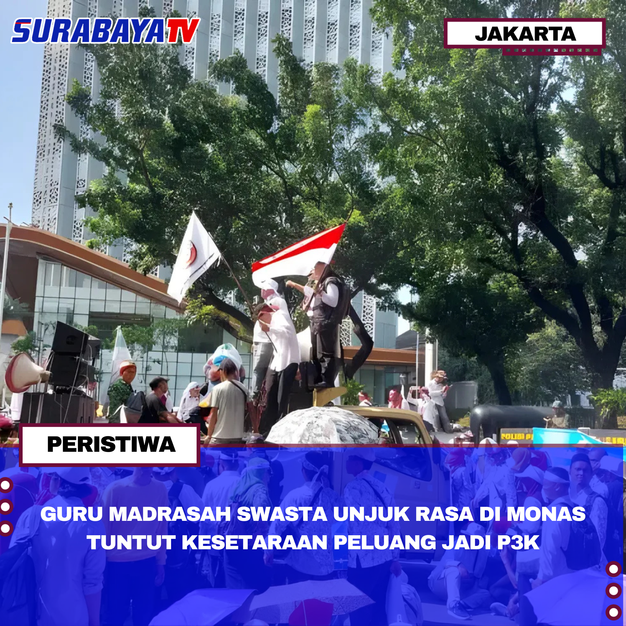 Jakarta – Ratusan guru madrasah swasta dari berbagai organisasi seperti PGSI, PGIN, PGMM, dan PGMNI menggelar aksi unjuk rasa di kawasan Monas, Jakarta Pusat, pagi 30 Oktober 2025. Mereka berasal dari daerah seperti Cirebon, Pati, Banten, Tangerang, dan Tasikmalaya, kompak pakai seragam, ikat kepala, bendera, plus poster tuntutan. Satu ruas Jalan Medan Merdeka Selatan ditutup aparat buat mereka orasi bergantian dari mobil komando, sampaikan aspirasi soal kesetaraan profesi di bawah naungan Kemenag.
