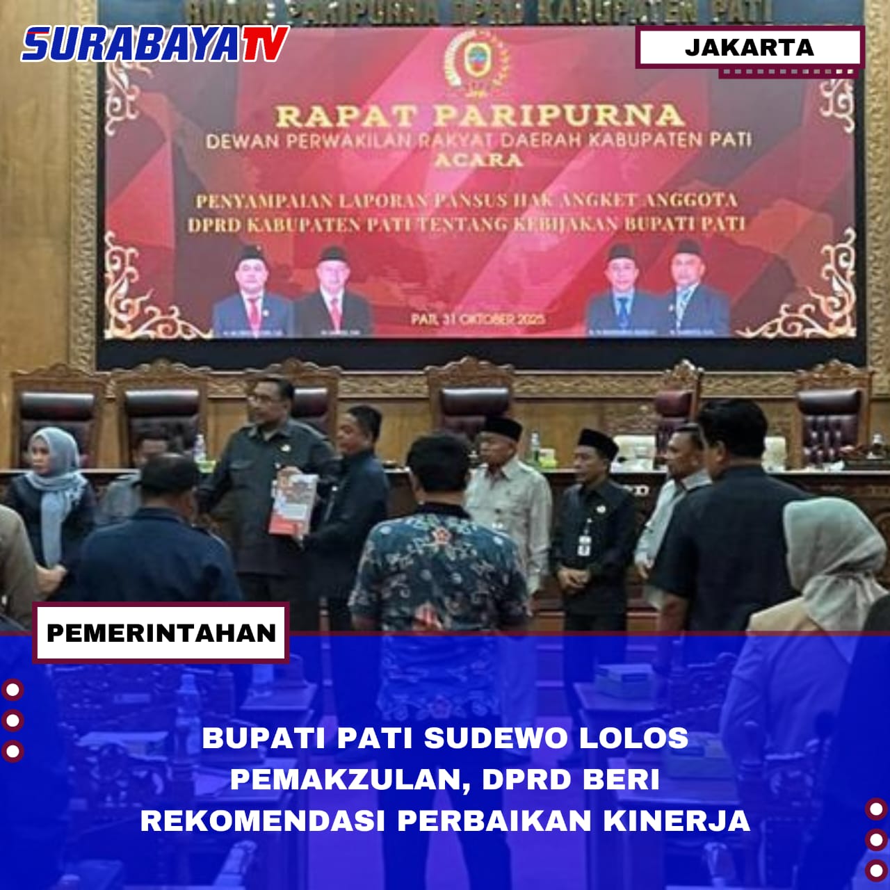 Jakarta – DPRD Kabupaten Pati memutuskan memberikan rekomendasi perbaikan kinerja kepada Bupati Sudewo usai rapat paripurna hak angket pada Jumat (31/10/2025), menolak opsi pemakzulan yang diusulkan Fraksi PDI Perjuangan. Ketua DPRD Ali Badrudin menjelaskan agenda utama mencakup penyampaian laporan panitia khusus dan sikap fraksi, dengan enam fraksi (Gerindra, PPP, PKB, Demokrat, PKS, Golkar) mendukung rekomendasi, sementara PDI Perjuangan ingin memakzulkan.