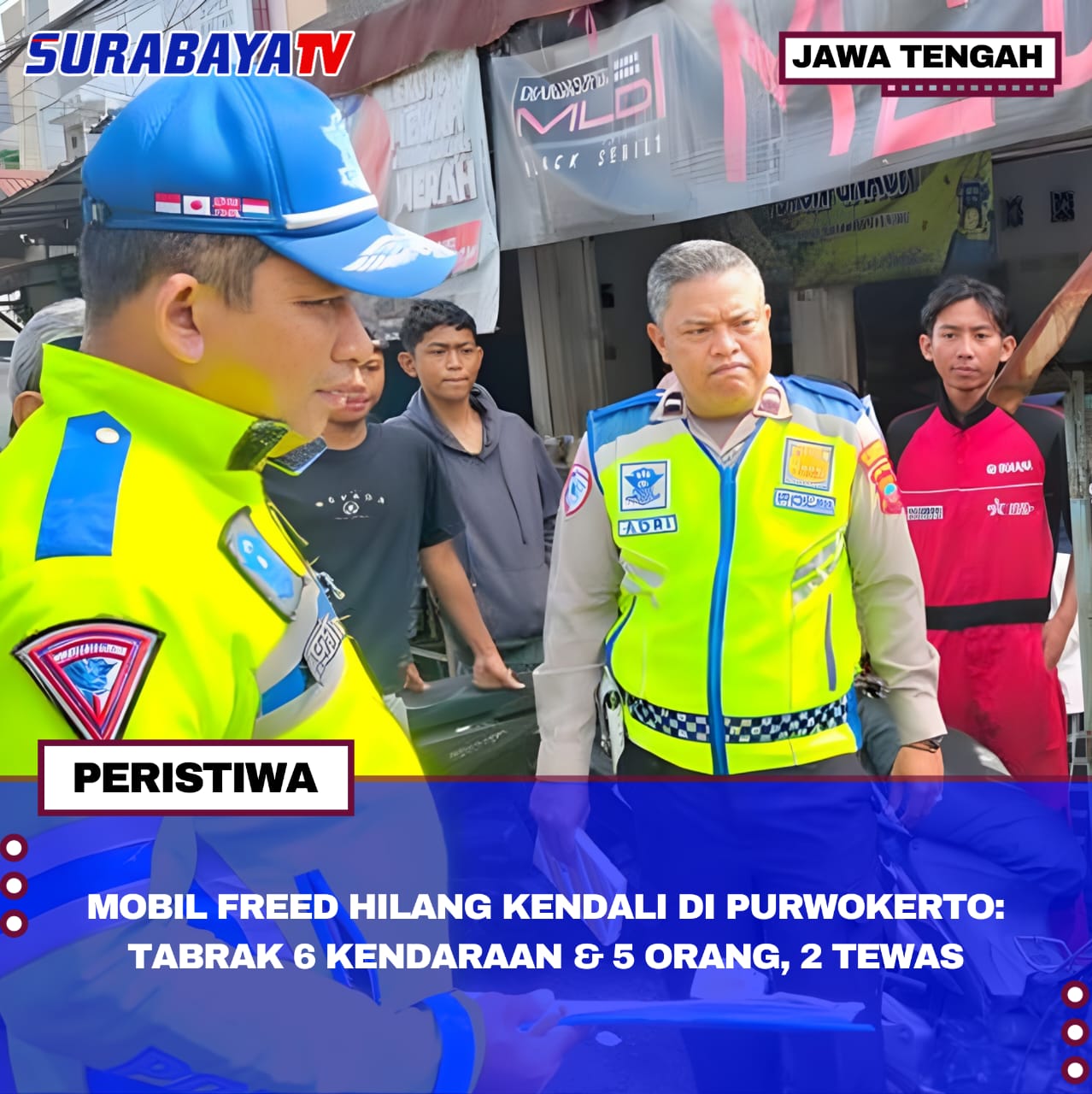 Kendaraan yang kena imbas termasuk pikap Colt R-8771-MF dan motor-motor seperti Supra R-2276-YR, Mega Pro R-2331-SE, Beat R-4390-IS, Titan R-2826-AH, plus Xeon R-4093-MG. Korban jiwa adalah MAG (41) dari Tanjung dan A (58) dari Purwokerto Kulon, sementara yang luka: SP (47), M (52), dan S (65). “Dugaan sementara pengemudi mobil Freed kehilangan kendali dan oleng ke kiri hingga menabrak pejalan kaki serta beberapa kendaraan yang sedang terparkir di bahu jalan,” kata Kasatlantas Polresta Banyumas, Kompol Harman Rumenegge Sitorus.