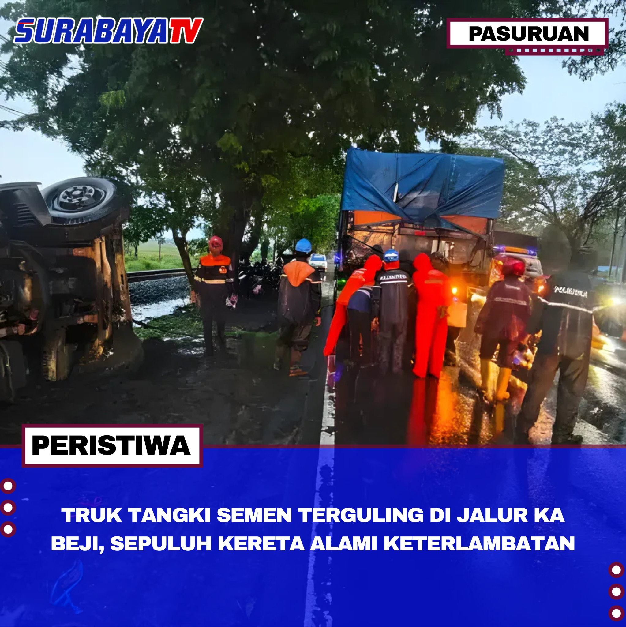 Pasuruan – Sebuah truk tangki pengangkut semen curah terguling dan menutupi jalur kereta api di KM 44+3, Beji, Kabupaten Pasuruan, Jawa Timur, pada Kamis (13/11/2025) sekitar pukul 15.20 WIB. Kecelakaan ini menyebabkan terputusnya jalur perkeretaapian antara Stasiun Porong dan Stasiun Bangil. Tim Gabungan dari PT Kereta Api Indonesia (KAI) Daop 8 Surabaya segera dikerahkan ke lokasi untuk melakukan proses evakuasi kendaraan dan sterilisasi jalur.