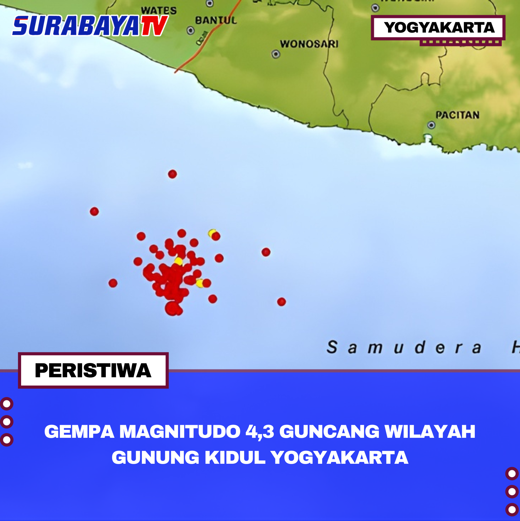 Yogyakarta – Sebuah gempa bumi berkekuatan magnitudo 4,3 mengguncang wilayah Gunung Kidul, Yogyakarta, pada Senin (17/11/2025) dini hari pukul 03:29 WIB. Menurut data yang dirilis oleh Badan Meteorologi, Klimatologi, dan Geofisika (BMKG), pusat gempa berada di lokasi 115 kilometer arah Barat Daya Gunung Kidul. Episentrum gempa tercatat pada koordinat 9.03 Lintang Selatan dan 110.49 Bujur Timur dengan kedalaman hiposenter 10 kilometer.