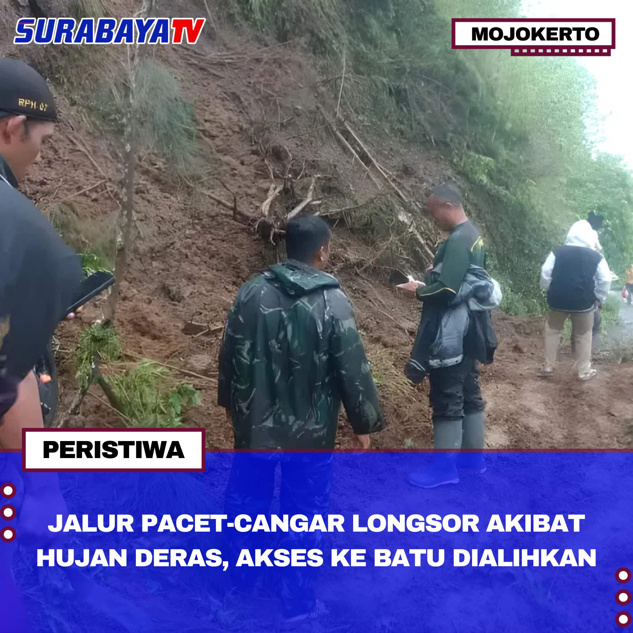 Mojokerto – Hujan deras yang mengguyur Kabupaten Mojokerto sejak siang hari Senin (24/11/2025) memicu tanah longsor di jalur Pacet-Cangar, tepatnya di Kutukan Sendi. Kejadian dimulai sekitar pukul 14.00 WIB, membuat jalur utama menuju Kota Batu tak bisa dilalui kendaraan apa pun. Anggota PMI Mojokerto, Didik, pertama kali melaporkan insiden ini melalui Radio Suara Surabaya, menekankan bahaya longsor yang masih aktif dan potensi tambahan material jatuh.