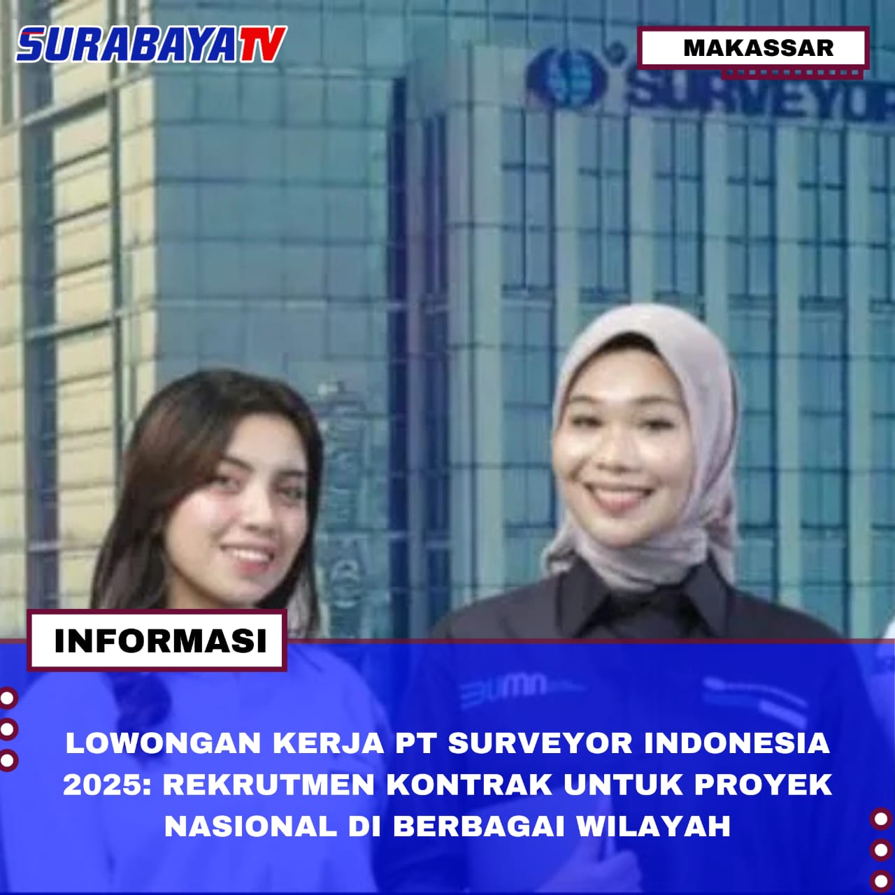 Jakarta – PT Surveyor Indonesia (Persero) cabang Makassar membuka rekrutmen pegawai kontrak berbasis proyek untuk penempatan di Sulawesi, Maluku, Papua, Jawa Barat, dan Banten. Lowongan ini ditujukan bagi profesional dengan kualifikasi teknis sesuai kebutuhan proyek nasional yang sedang berjalan. Informasi resmi dirilis melalui akun Instagram @surveyor.id.