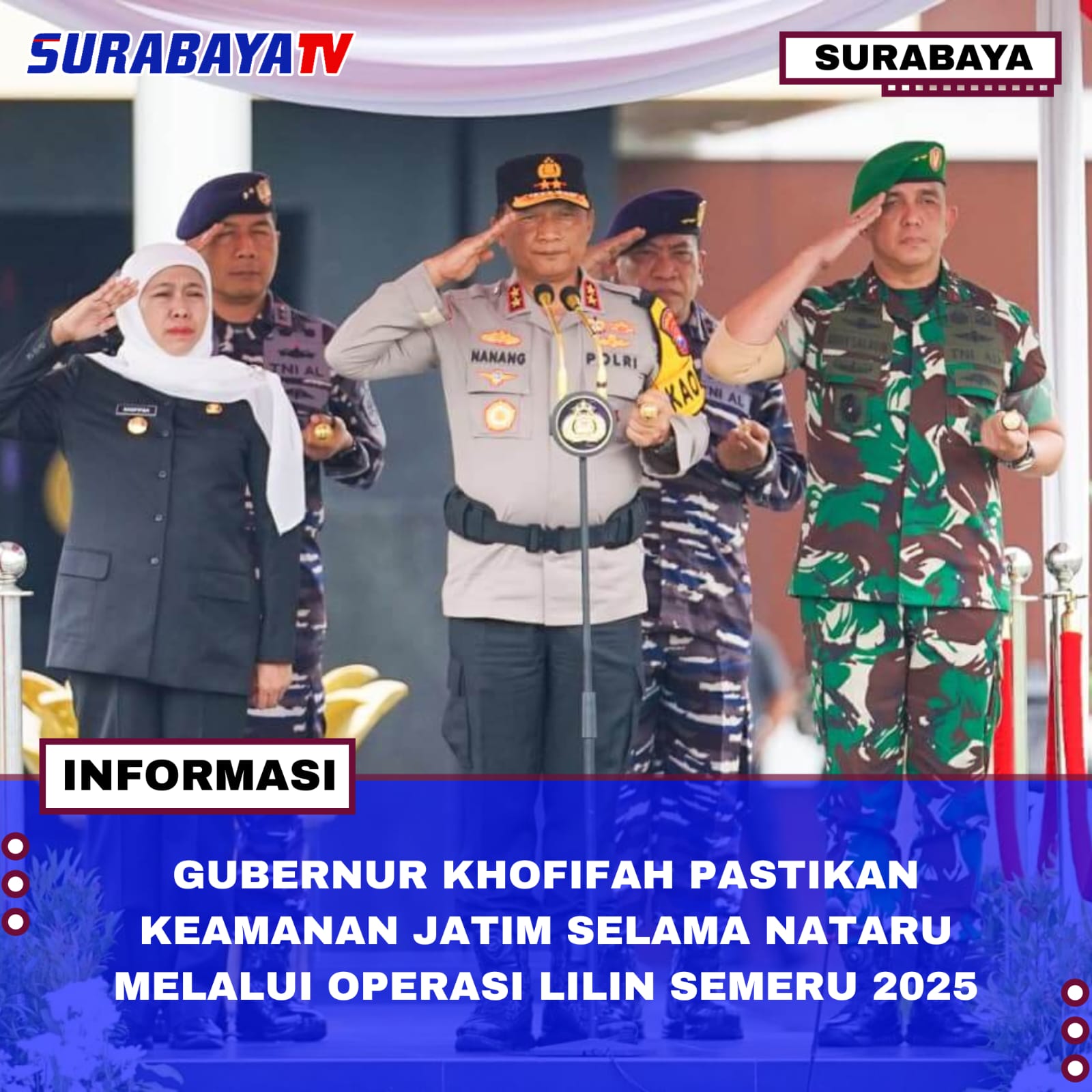 Surabaya – Gubernur Jawa Timur, Khofifah Indar Parawansa, memastikan pengamanan Natal dan Tahun Baru 2026 berjalan kondusif melalui sinergi TNI, Polri, dan instansi terkait. Operasi Lilin Semeru 2025 yang berlangsung selama 14 hari sejak 20 Desember ini mengerahkan 146.701 personel gabungan serta menyiagakan 2.903 posko untuk mengawasi 44.000 lebih objek vital di Jawa Timur.