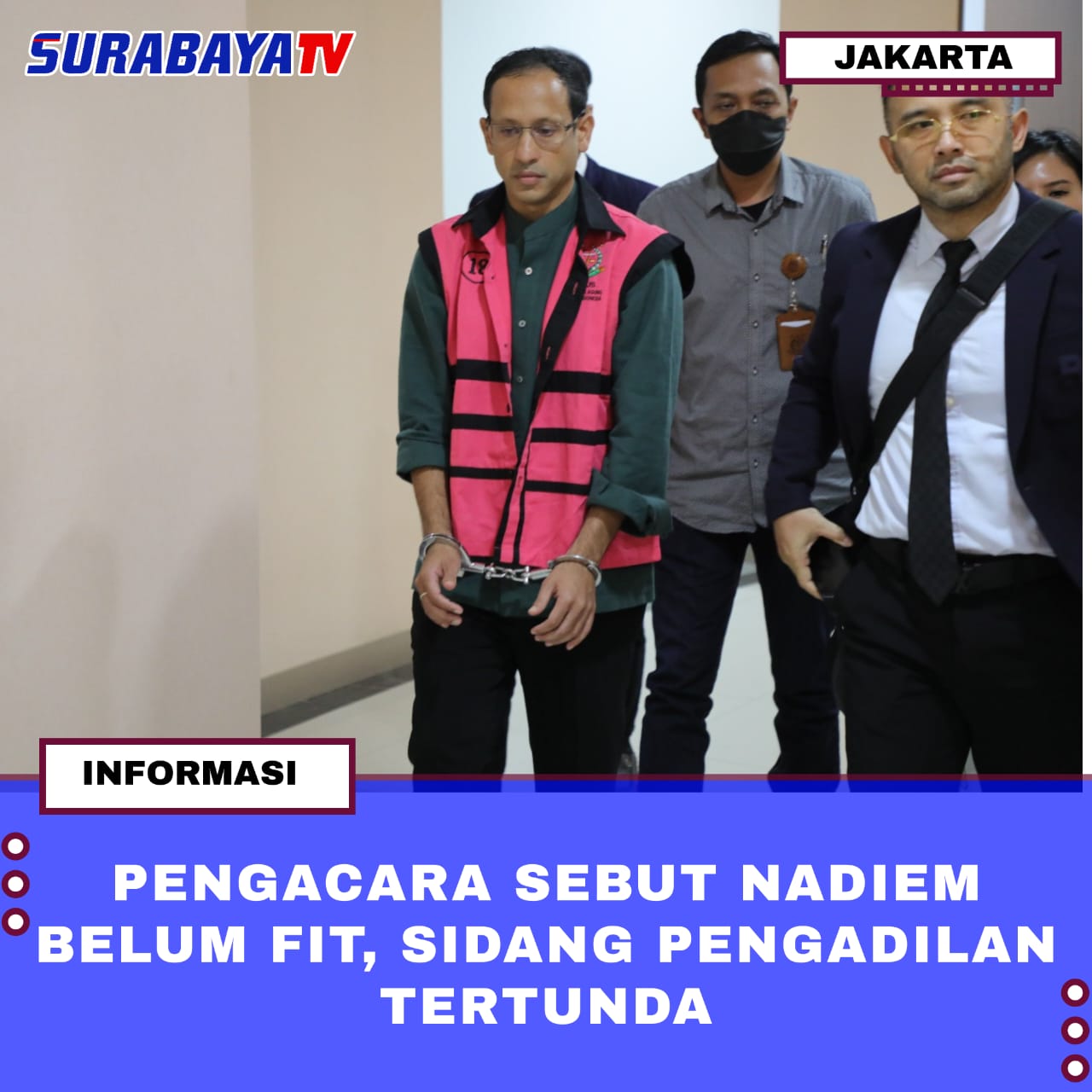 Jakarta- Sidang terhadap mantan Menteri Pendidikan, Kebudayaan, Riset, dan Teknologi, Nadiem Anwar Makarim, kembali ditunda. Kuasa hukum menyatakan Nadiem masih dalam kondisi sakit sehingga belum memungkinkan untuk mengikuti persidangan yang dijadwalkan di Pengadilan Tipikor Jakarta Pusat.