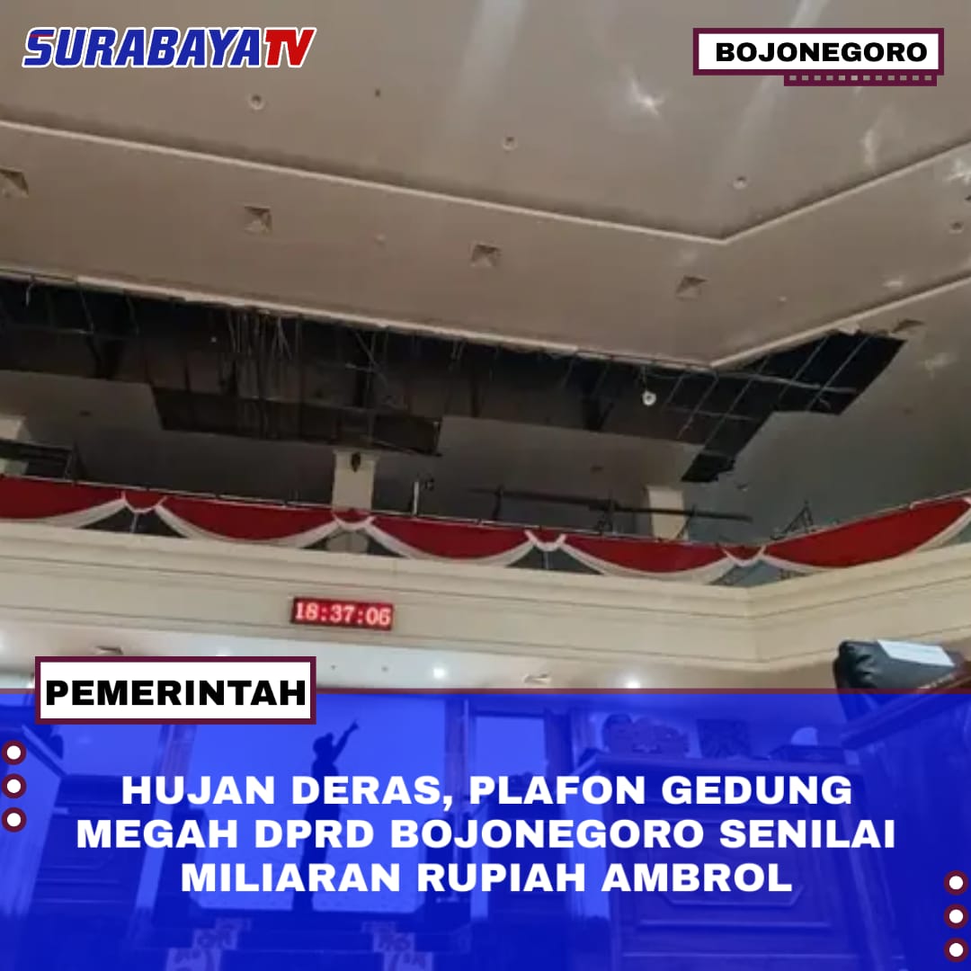 Bojonegoro – Hujan deras disertai angin kencang yang melanda wilayah Bojonegoro pada Selasa (23/12/2025) menyebabkan plafon ruang rapat paripurna Gedung DPRD Bojonegoro ambrol. Kerusakan yang diperkirakan seluas 25 x 5 meter tersebut terjadi tepat di atas pintu masuk ruang sidang, hingga mengakibatkan air hujan masuk dan menggenangi ruangan. Beruntung, tidak ada korban jiwa dalam insiden ini karena gedung sedang dalam kondisi kosong tanpa ada agenda rapat.