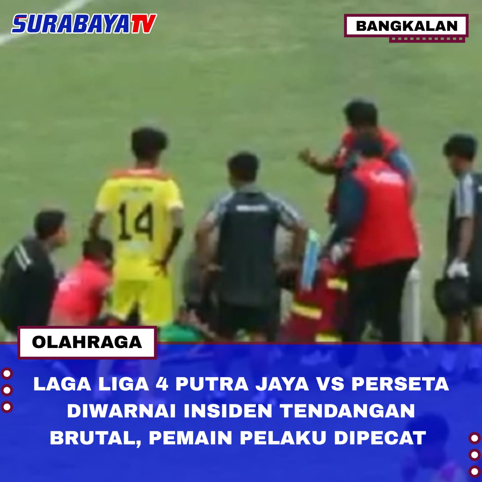 Bangkalan – Pertandingan Liga 4 yang mempertemukan Putra Jaya Kabupaten Pasuruan melawan Perseta 1970 Tulungagung di Stadion Gelora Bangkalan, Senin (5/1/2026), diwarnai insiden tendangan brutal. Aksi tidak sportif yang dilakukan oleh salah satu pemain Putra Jaya terhadap pemain lawan di bagian dada ini mencoreng sportivitas sepak bola nasional.