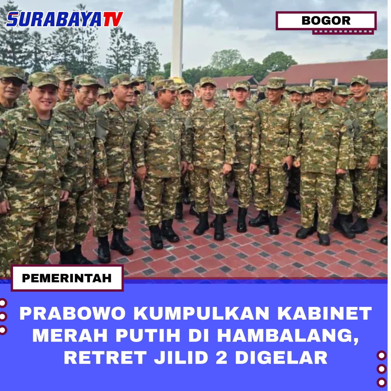 Bogor-Presiden Prabowo Subianto menggelar retret Kabinet Merah Putih jilid kedua pada Selasa, 6 Januari 2026, di kediaman pribadinya di Hambalang, Bogor, Jawa Barat. Kegiatan ini diikuti oleh seluruh jajaran kabinet, mulai dari menteri, wakil menteri, hingga kepala lembaga dan badan negara sebagai agenda konsolidasi pemerintahan.