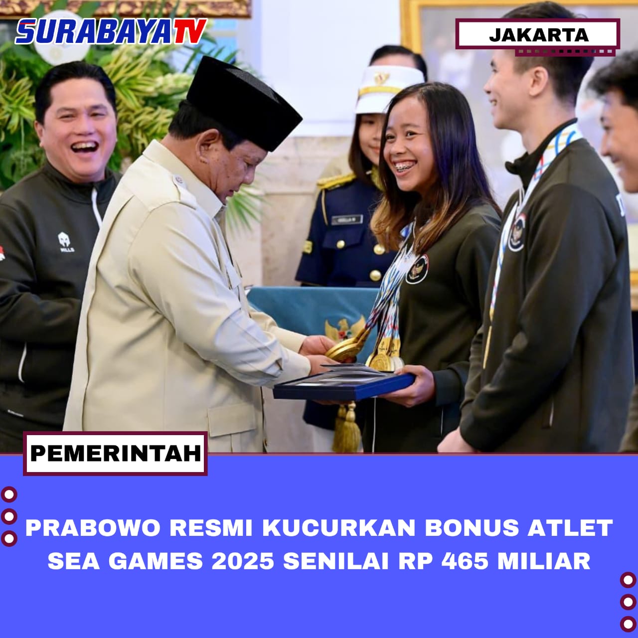 Jakarta – Presiden Prabowo Subianto resmi memberikan bonus kepada para atlet Indonesia peraih medali emas, perak, dan perunggu pada ajang SEA Games 2025 yang digelar di Thailand. Total nilai bonus yang diberikan pemerintah kepada para atlet mencapai Rp 465 miliar.