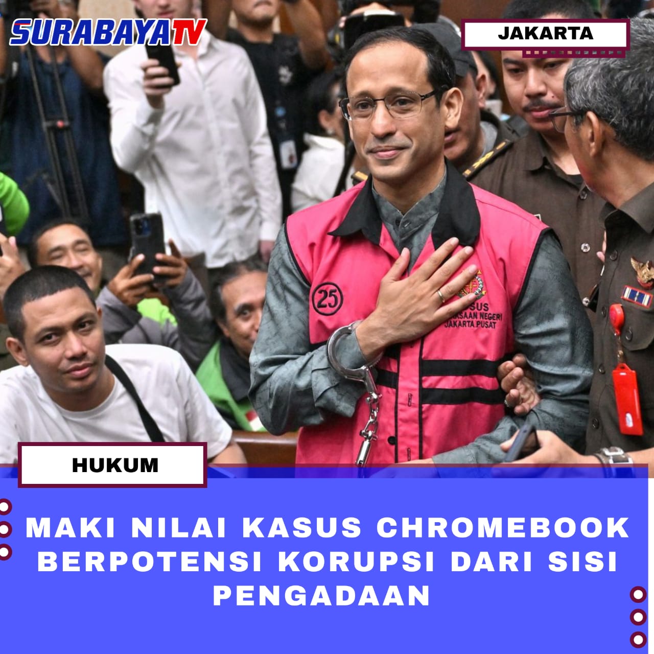 Jakarta—Majelis hakim kembali menggelar sidang lanjutan kasus dugaan korupsi pengadaan laptop Chromebook yang menyeret eks Menteri Pendidikan, Kebudayaan, Riset, dan Teknologi, Nadiem Makarim, di Pengadilan Tipikor Jakarta Pusat. Kasus ini diduga merugikan negara hingga triliunan rupiah dan masih menunggu putusan sela serta kelanjutan proses pembuktian di persidangan.