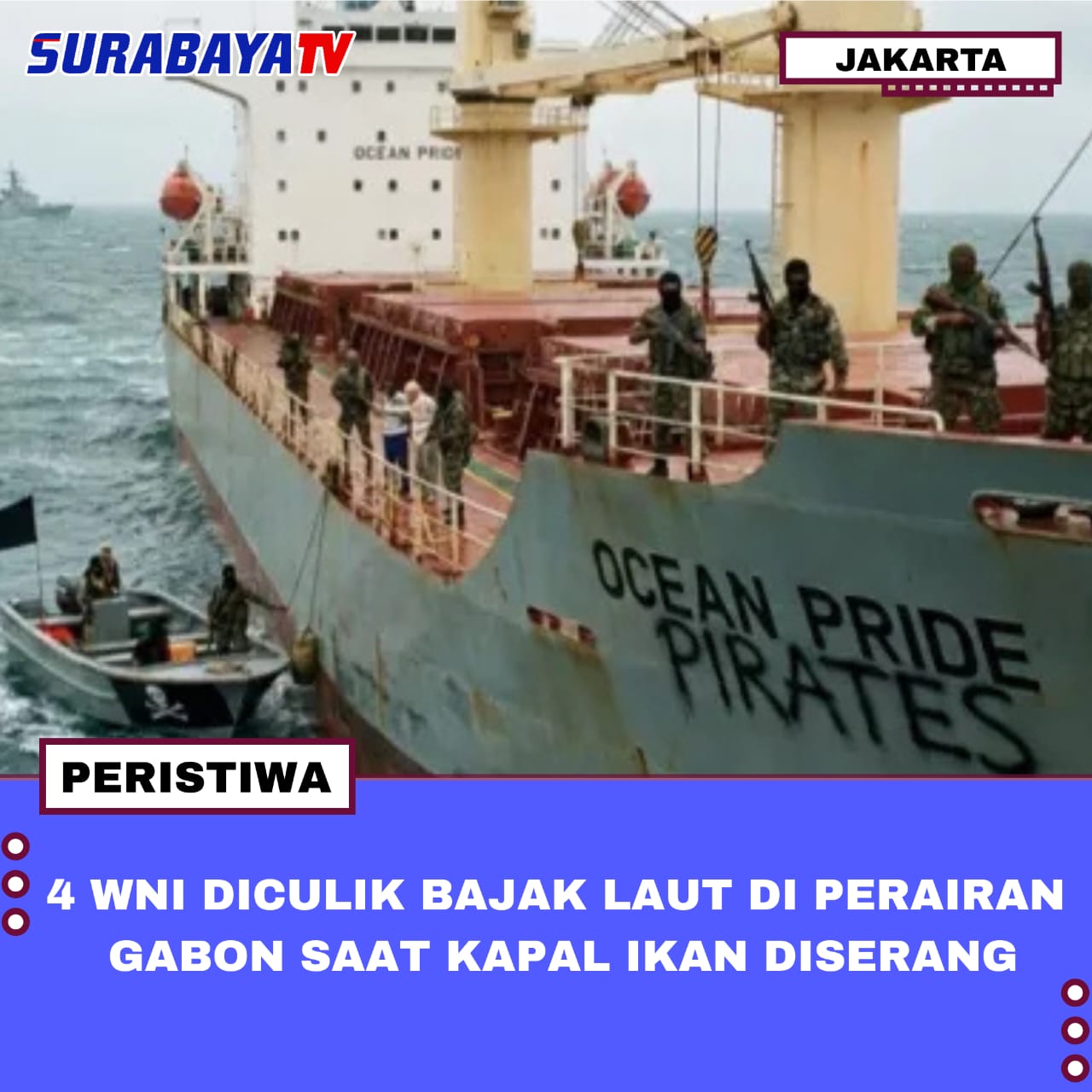 Jakarta – Empat warga negara Indonesia (WNI) dilaporkan diculik bajak laut setelah kapal penangkap ikan berbendera Gabon, IB FISH 7, diserang saat menangkap ikan di perairan Gabon, sekitar 7 mil laut tenggara Equata. Dalam insiden tersebut, total sembilan awak kapal diculik, terdiri dari empat WNI dan lima warga negara China.