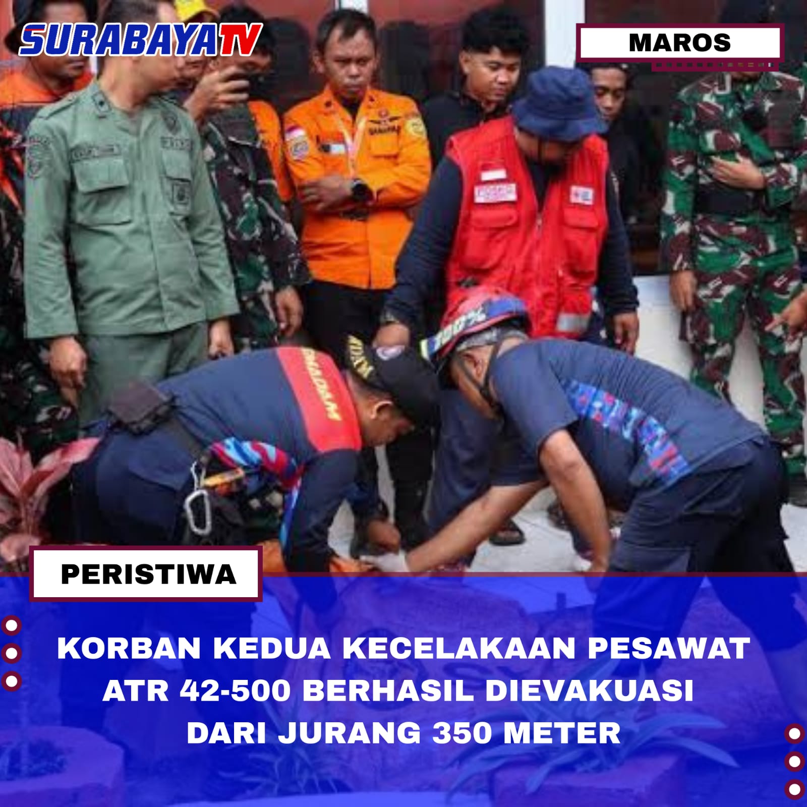 Maros – Tim pencarian dan pertolongan (SAR) gabungan berhasil mengevakuasi jenazah korban kedua dari lokasi kecelakaan pesawat ATR 42-500 di Gunung Bulusaraung, Kabupaten Pangkajene dan Kepulauan (Pangkep), Sulawesi Selatan. Evakuasi dilakukan dari kedalaman sekitar 350 meter di dalam jurang yang memiliki medan sangat terjal dan berbatu, Selasa malam (20/1/2026). Korban diketahui berjenis kelamin perempuan dan jenazahnya kini dibawa ke Posko SAR sebelum diserahkan kepada tim Disaster Victim Identification (DVI) untuk proses identifikasi lebih lanjut.