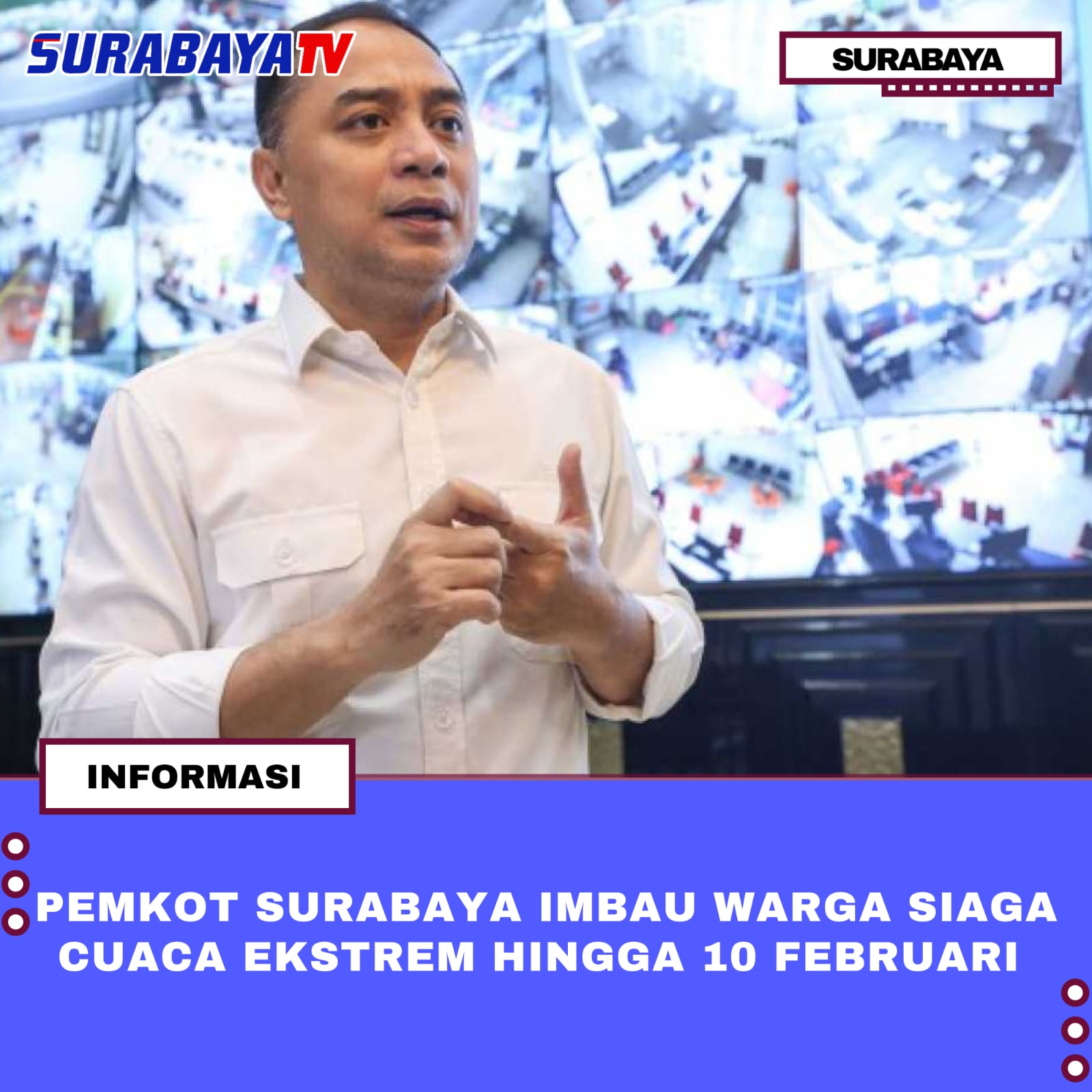 Surabaya—Pemerintah Kota Surabaya mengimbau seluruh warga untuk siaga menghadapi cuaca ekstrem yang diprediksi berlangsung hingga 10 Februari 2026. Peringatan ini dikeluarkan menyusul informasi dari BMKG yang memperkirakan potensi hujan lebat, angin kencang, hujan es, hingga puting beliung di wilayah Surabaya dan sekitarnya.