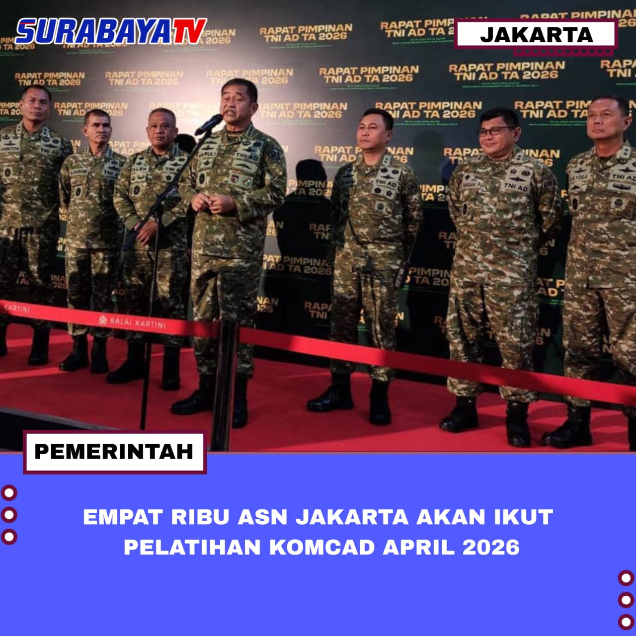Jakarta — Kamis, 12 Januari 2026, Sebanyak empat ribu aparatur sipil negara (ASN) dari 49 kementerian dan lembaga di Jakarta akan menjalani pelatihan menjadi komponen cadangan alias Komcad pada April 2026. Komponen cadangan sendiri diatur dalam UU No. 23 Tahun 2019 tentang Pengelolaan Sumber Daya Nasional untuk Pertahanan Negara. Pasal 28 ayat 2 UU tersebut menjelaskan Komcad merupakan pengabdian dalam usaha pertahanan negara yang bersifat sukarela. Menhan Sjafrie Sjamsoeddin menyampaikan pelatihan dasar militer ini akan diikuti oleh ASN yang berusia 18 hingga 35 tahun. Sjafrie menyebut pelatihan komcad ini bertujuan menumbuhkan jiwa nasionalisme dan cinta Tanah Air dalam pengabdian kepada negara.