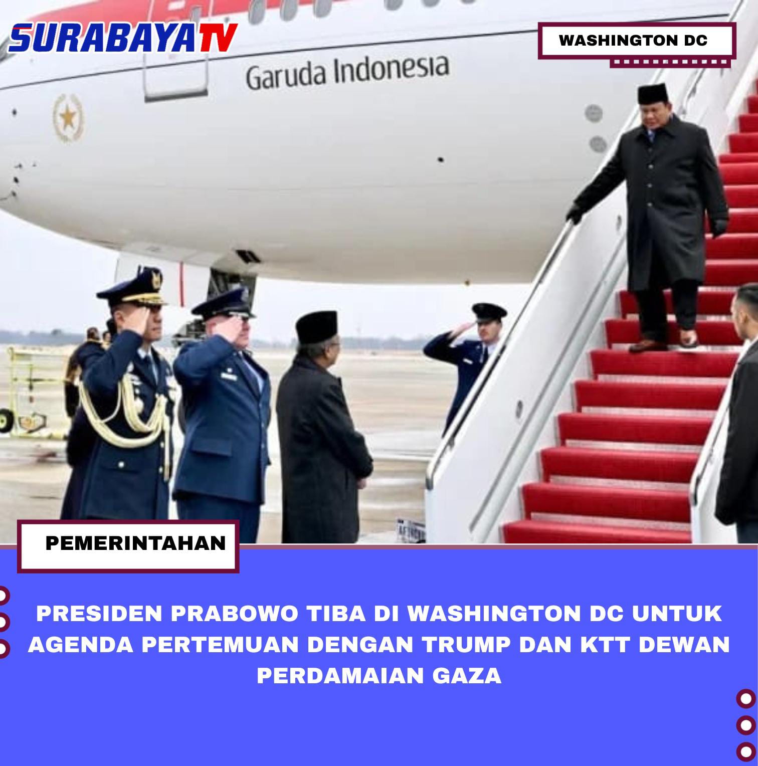 Washington DC – Presiden Prabowo Subianto tiba di Pangkalan Militer Joint Base Andrews, Maryland, Amerika Serikat, pada Selasa 17 Februari 2026 pukul 12.00 waktu setempat, menggunakan pesawat Garuda Indonesia PK-GIF. Kedatangan orang nomor satu di Indonesia itu disambut oleh Duta Besar RI untuk AS Dwisuryo Indroyono Soesilo, Atase Pertahanan KBRI Washington DC Marsekal Pertama TNI E Wisoko Aribowo, serta perwakilan Angkatan Udara AS Kolonel Gary Charland. Dalam kunjungan kerjanya kali ini, Presiden Prabowo dijadwalkan menghadiri tiga agenda utama, yaitu pertemuan dengan kelompok pebisnis AS, KTT perdana Dewan Perdamaian (Board of Peace/BoP) Gaza, serta pertemuan bilateral dengan Presiden AS Donald Trump.