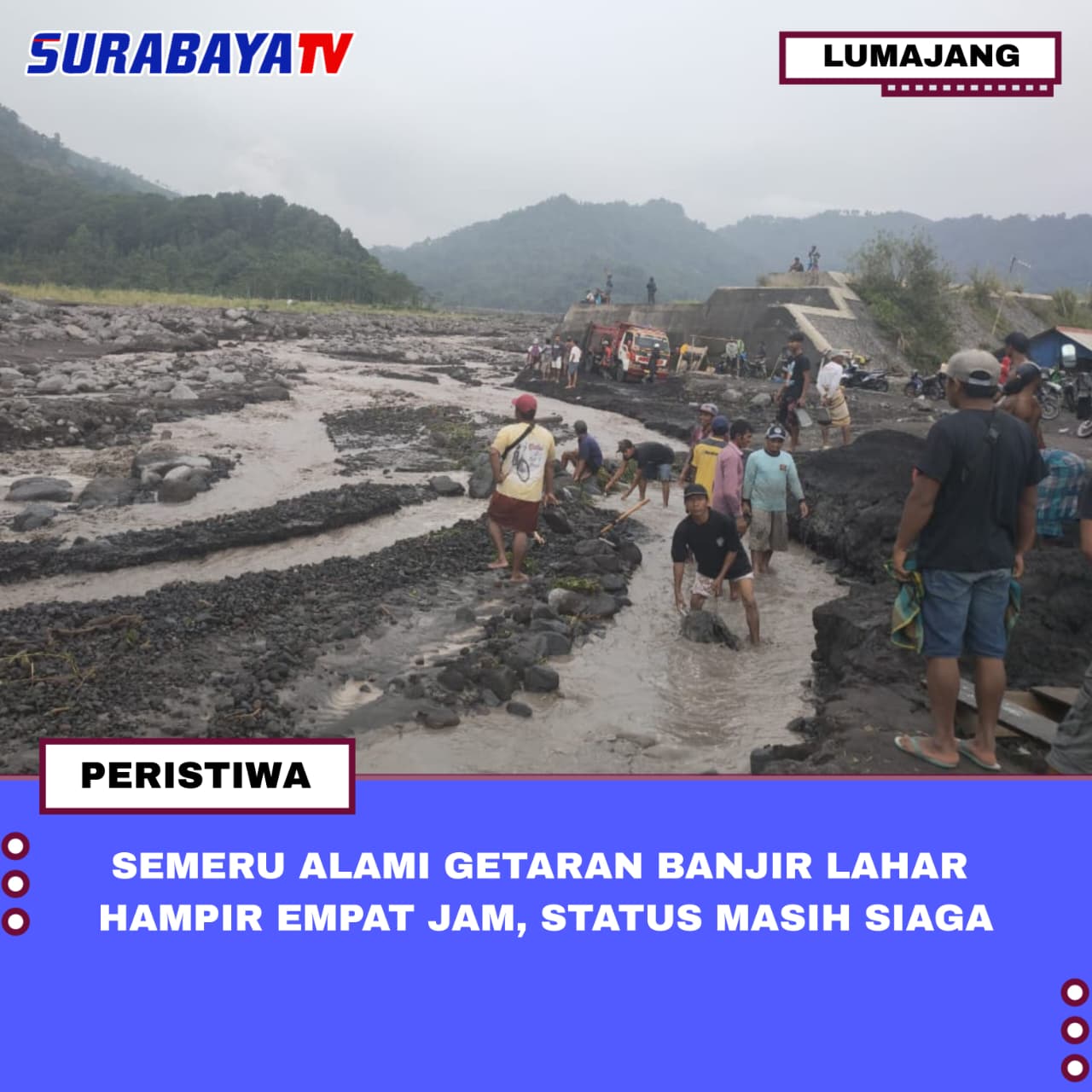Lumajang – Kamis, 26 Februari 2026, Gunung Semeru pada Kamis (26/2/2026) tercatat mengalami getaran banjir lahar selama hampir empat jam akibat hujan deras yang mengguyur Kabupaten Lumajang, Jawa Timur. Sigit Rian Alfian Petugas Pos Pengamatan Gunung Semeru menerangkan terdapat satu kali gempa getaran banjir dalam periode pengamatan pukul 00.00 – 06.00 WIB. Selain itu, Pos Pengamatan Gunung Semeru juga melaporkan adanya aktivitas kegempaan sebanyak 17 kali erupsi selama enam jam terakhir, dengan amplitudo 11-22 mm dan berdurasi 65-104 detik. Gempa guguran terjadi tiga kali dengan amplitudo 2-3 mm dan berdurasi 33-40 detik, serta gempa embusan terjadi satu kali dengan amplitudo 6 mm dan lama gempa 51 detik.