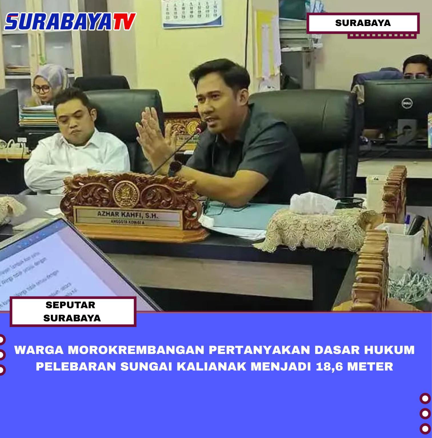 SURABAYA – Warga Morokrembangan mempertanyakan dasar hukum pelebaran ruang manfaat Sungai Kalianak hingga 18,6 meter dalam rapat dengar pendapat (hearing) bersama pemkot, Senin (2/3/2026). Mereka meminta pemkot menunda penandaan bangunan terdampak sebelum ada kejelasan regulasi dan sinkronisasi data antara Pemprov Jawa Timur dan Pemkot Surabaya. “Saya minta sebaiknya pihak pemkot jangan melakukan penandaan kepada bangunan yang terdampak pelebaran sungai sebelum semuanya jelas dan disepakati bersama,” tegas salah satu perwakilan warga.