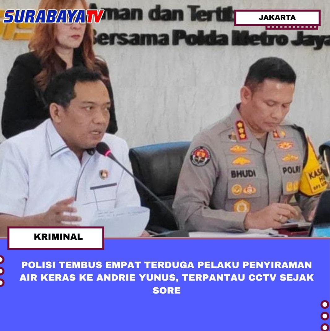 JAKARTA – Polda Metro Jaya mengidentifikasi empat orang terduga pelaku penyiraman air keras terhadap Wakil Koordinator KontraS Andrie Yunus berdasarkan rekaman kamera pengawas (CCTV) di sejumlah area Jakarta. Direktur Reserse Kriminal Umum Polda Metro Jaya Kombes Pol Iman Imanuddin mengungkapkan keempat terduga pelaku berboncengan menggunakan dua sepeda motor berbeda dan telah memantau pergerakan korban sejak sore hari sebelum kejadian. “Diduga empat orang terduga pelaku yang menggunakan dua sepeda motor menunggu korban di depan KFC Cikini,” ujarnya di Jakarta, Senin (16/3/2026).