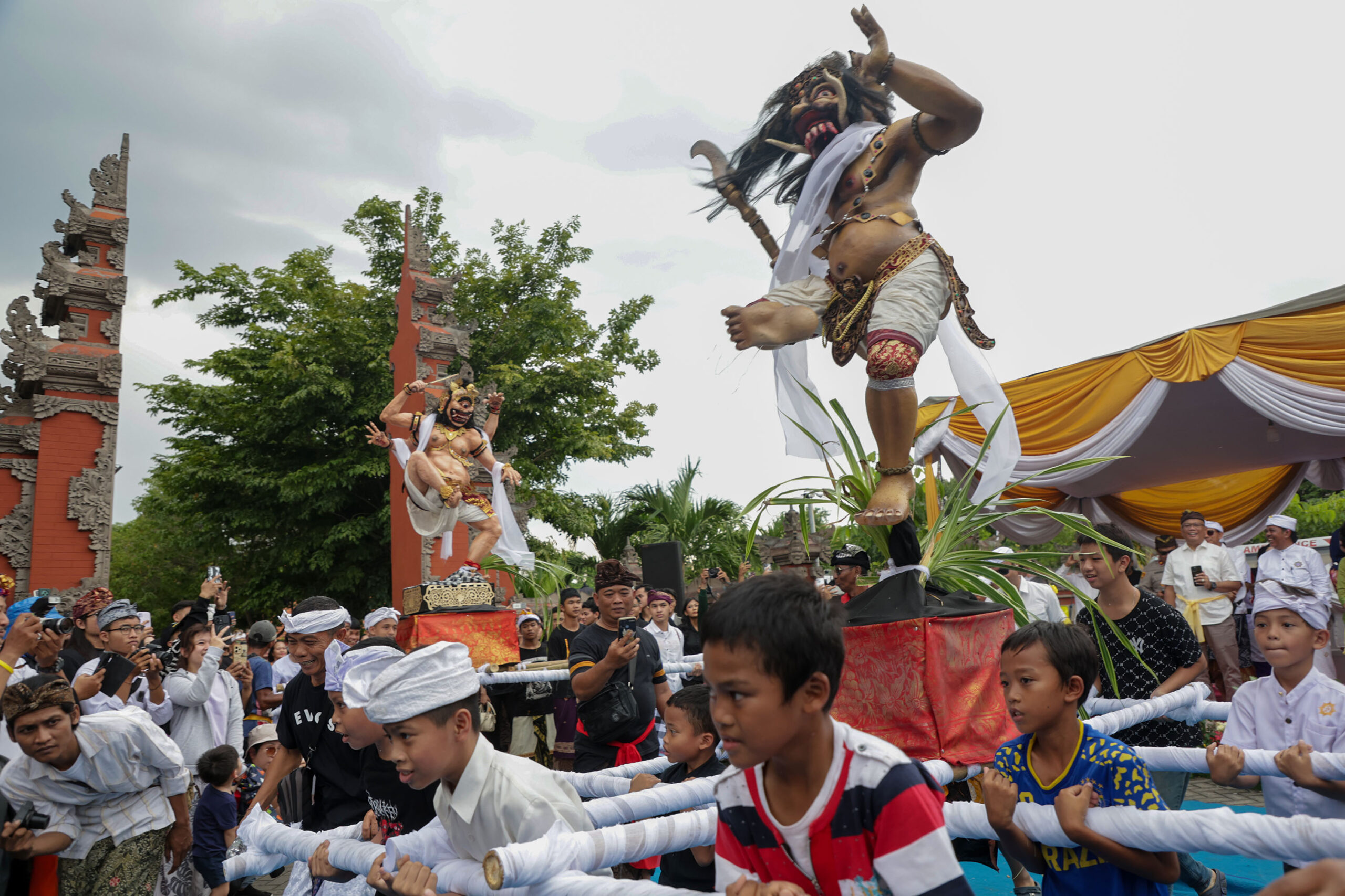 Ogoh-ogoh berbentuk raksasa diarak dengan penuh semangat, menampilkan kreativitas sekaligus menyimpan makna filosofis sebagai representasi sifat-sifat negatif yang harus disucikan menjelang pelaksanaan Catur Brata Penyepian.