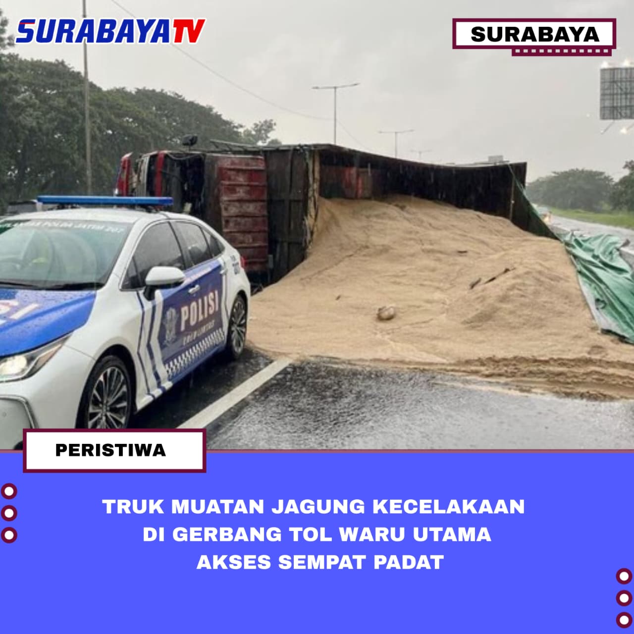 Surabaya – Jumat, 27 Maret 2026. Sebuah truk bermuatan jagung mengalami kecelakaan tunggal di Gerbang Tol Waru Utama di ruas Tol Perak arah Waru, Jumat (27/3/2026) sekitar pukul 06.50 WIB. AKP Mulyani Kanit PJR Jatim 2 menjelaskan, penyebab kecelakaan truk tersebut akibat ban belakang as roda patah. Dalam insiden tersebut, Mulyani memastikan tidak ada korban jiwa.
