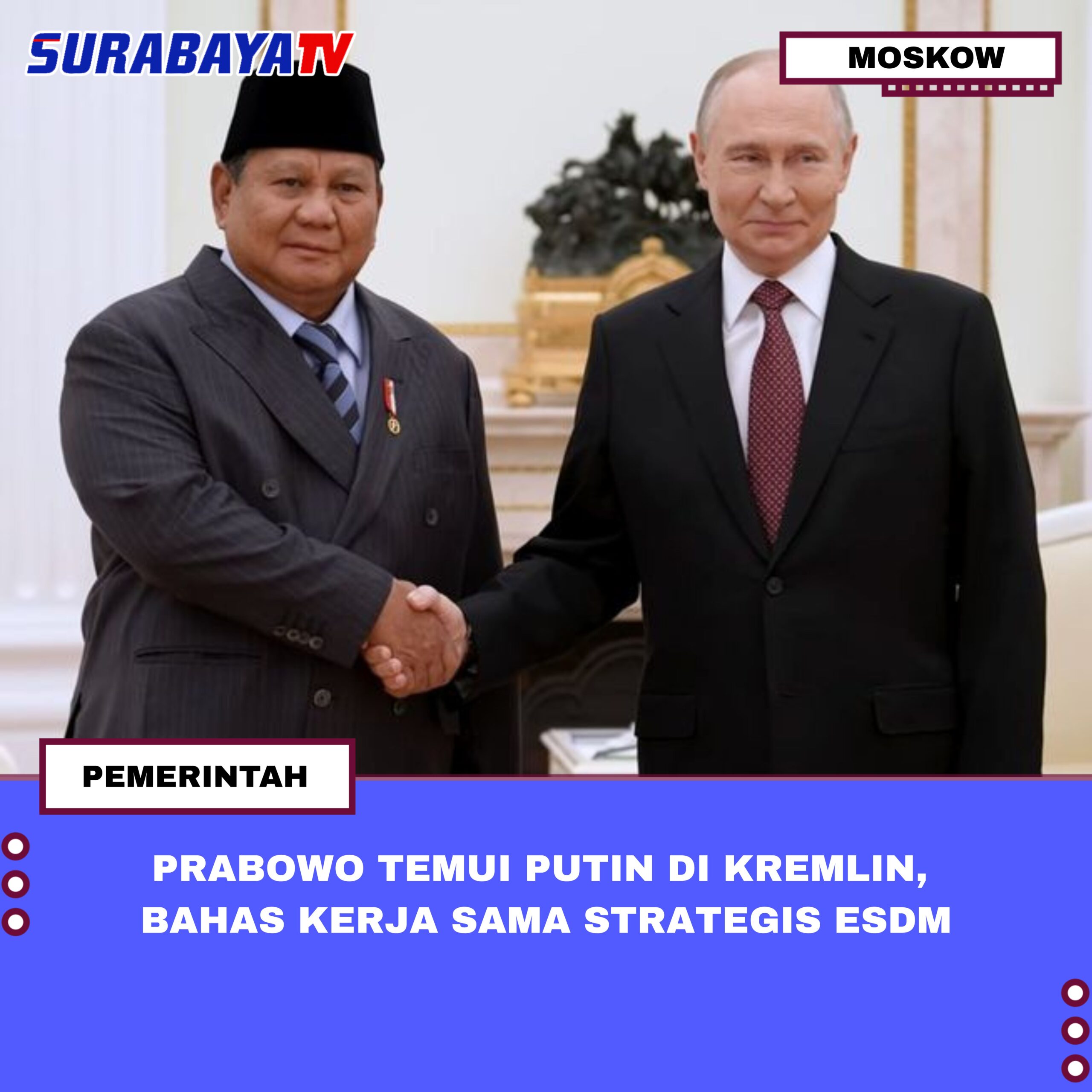 Moskow – Selasa, 14 April 2026, Prabowo Subianto Presiden Republik Indonesia, Senin (13/4/2026), melakukan pertemuan khusus dengan Vladimir Putin Presiden Federasi Rusia, di Istana Kremlin, Moskow. Teddy Indra Wijaya Sekretaris Kabinet (Seskab) yang mendampingi Prabowo berkunjung ke Rusia mengatakan, pertemuan Prabowo-Putin berlangsung selama lima jam. Awalnya, Presiden RI dan Presiden Rusia melakukan pertemuan bilateral selama dua jam.