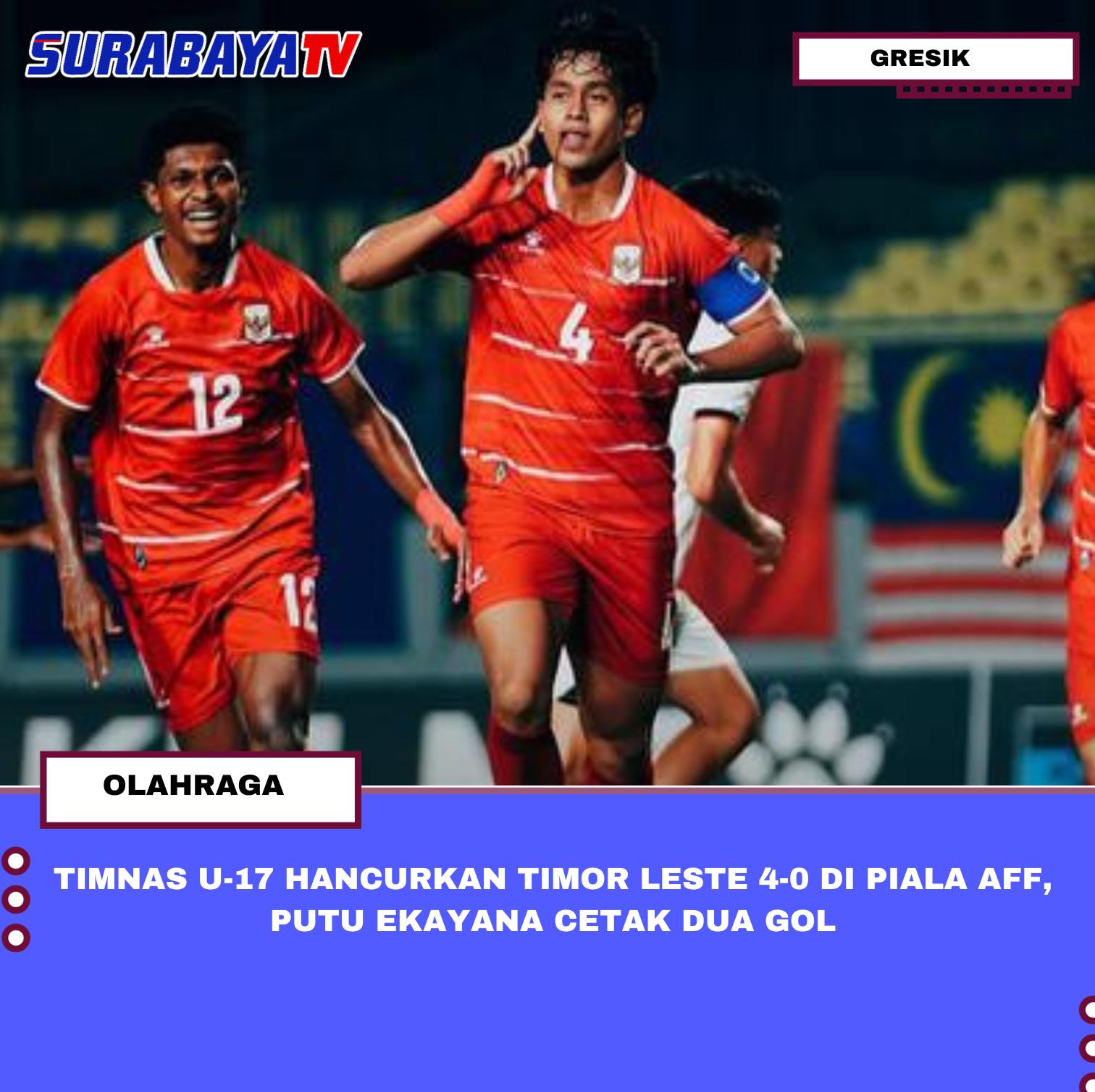 GRESIK – Timnas Indonesia U-17 memulai langkah di Piala AFF U-17 dengan kemenangan telak 4-0 atas Timor Leste di Stadion Gelora Joko Samudro, Gresik, Senin (13/4/2026) malam. Garuda Muda langsung tancap gas sejak awal pertandingan. Putu Ekayana menjadi bintang lapangan dengan mencetak dua gol cepat masing-masing pada menit ke-6 dan menit ke-17.Gol pembuka lahir saat laga baru berjalan enam menit. Putu yang berposisi sebagai bek berada di posisi tepat dan melepaskan finishing akurat. Sebelas menit berselang, ia kembali menjebol gawang Timor Leste yang dijaga Joao Baptista Con Anin. Kemenangan semakin melebar pada menit ke-36 melalui aksi Rihdo Ridho yang berhasil memperdaya pertahanan lawan, membawa skor menjadi 3-0 yang bertahan hingga turun minum.Memasuki babak kedua, Timor Leste tampil lebih kuat dan disiplin sehingga Indonesia dibuat kesulitan menembus pertahanan mereka. Seluruh skema serangan yang dibangun Putu Ekayana dan kolega berulang kali gagal, dengan strategi anak asuh Kurniawan Dwi Yulianto sudah mulai dipahami Timor Leste. Hingga tambahan waktu dua menit, tidak ada gol tambahan tercipta. Skor 4-0 bertahan untuk kemenangan Indonesia di laga perdana Piala AFF U-17 2026.