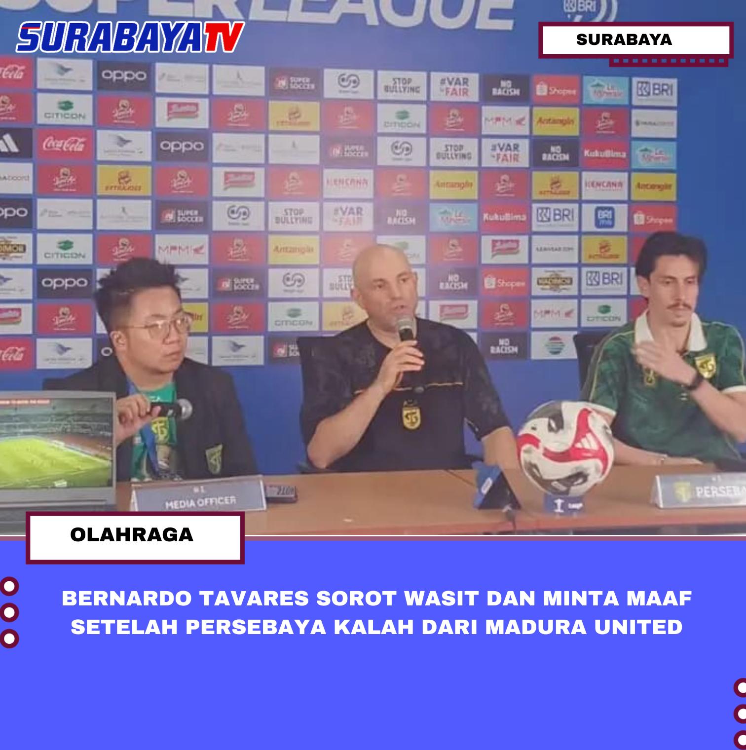 SURABAYA – Pelatih Persebaya Bernardo Tavares menyoroti kepemimpinan wasit dan menyampaikan permintaan maaf setelah timnya kalah 1-2 dari Madura United di Stadion Gelora Bung Tomo, Jumat (17/4/2026) malam. Tavares menilai ada pelanggaran di kotak penalti lawan yang seharusnya menjadi hadiah penalti, namun ia menegaskan bahwa keputusan wasit bukan alasan utama kekalahan timnya. “Terutama terkait pelanggaran di area penalti lawan yang tidak diberikan serta proses terjadinya gol kedua Madura United,” kata Tavares.Pelatih asal Portugal itu mengakui Madura United tampil lebih efektif dengan mampu mencetak dua gol meski hanya memiliki sedikit peluang. Sebaliknya, Persebaya yang menciptakan banyak kesempatan justru gagal berbuah gol karena penyelesaian akhir yang kurang akurat. “Kami menciptakan banyak kesempatan, namun kurang akurat dalam penyelesaian akhir,” ujarnya.Meski kecewa, Tavares mengapresiasi perjuangan maksimal para pemainnya dan meminta maaf kepada Bonek dan Bonita karena gagal mempersembahkan kemenangan di kandang sendiri. “Saya meminta maaf kepada Bonek dan Bonita. Kami tahu mereka menginginkan tiga poin, dan kami juga menginginkannya,” pungkasnya.