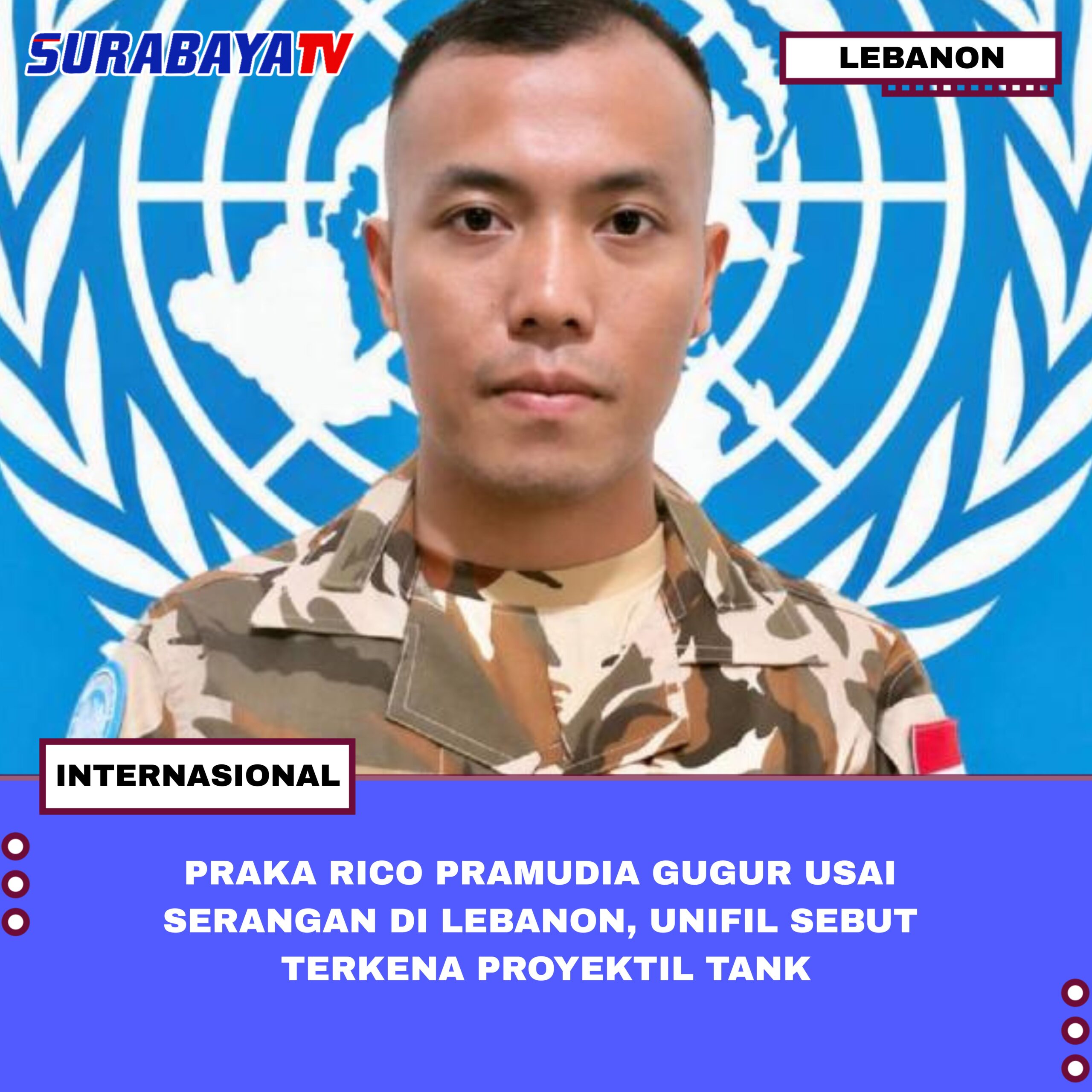 Lebanon – Sabtu, 25 April 2026, Praka Rico Pramudia menjadi prajurit TNI kedua yang meninggal dunia akibat serangan militer yang diduga dilakukan Israel terhadap posisi Pasukan Sementara PBB di Lebanon (UNIFIL) pada 29 Maret lalu. Stephane Dujarric juru bicara Sekretaris Jenderal PBB pada Jumat (24/4/2026) mengatakan, Praka Rico wafat setelah menjalani perawatan medis selama hampir sebulan akibat luka-luka yang dideritanya dalam insiden yang terjadi di Adchit Al-Qusayr itu. Kejadian yang sama juga menyebabkan gugurnya Praka Farizal Rhomadhon.