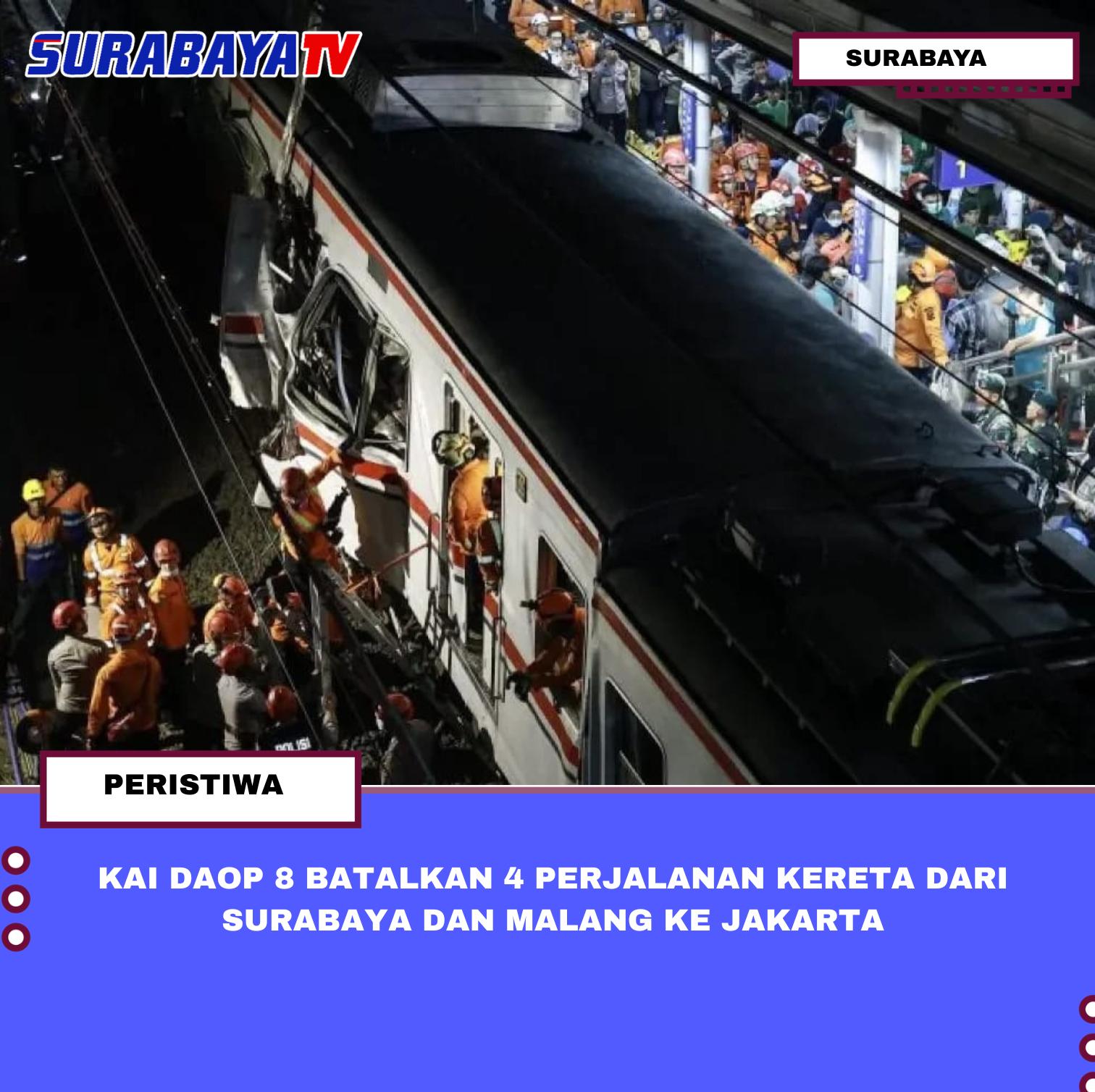 SURABAYA – PT KAI Daop 8 Surabaya membatalkan empat perjalanan kereta api dari Surabaya dan Malang menuju Jakarta pada Selasa (28/4/2026) buntut dari insiden tabrakan KRL di Stasiun Bekasi Timur. Awalnya pembatalan hanya mencakup tiga jadwal dari Surabaya, namun kemudian bertambah menjadi empat relasi. “KA 94-91 Jayabaya menuju Stasiun Pasarsenen juga turut batal,” ungkap Manager Humas PT KAI Daop 8 Surabaya Mahendro Trang Bawono di Radio Suara Surabaya.Kereta yang batal dari Stasiun Surabaya Pasarturi meliputi KA 163 Gumarang relasi Surabaya Pasarturi–Pasarsenen, KA 3B Argo Bromo Anggrek relasi Surabaya Pasarturi–Gambir, dan KA 29F Argo Anjasmoro relasi Surabaya Pasarturi–Gambir. Sementara satu jadwal lagi dari Stasiun Malang yakni KA 94-91 Jayabaya tujuan Pasarsenen juga ikut dibatalkan. Mahendro menjelaskan bahwa KA Argo Bromo Anggrek yang berangkat pagi ini juga mengalami penyesuaian rangkaian karena rangkaian stainless steel new generation terdampak insiden di Bekasi.Informasi terakhir, evakuasi korban akibat insiden tabrakan KRL di Bekasi Timur yang terjadi Senin (27/4/2026) malam masih terus berlangsung. Daop 1 Jakarta telah melakukan pembatalan perjalanan KA sejak insiden terjadi. KAI mengimbau calon penumpang untuk mengecek informasi jadwal terbaru sebelum bepergian dan memastikan akomodasi alternatif bagi penumpang yang terdampak.